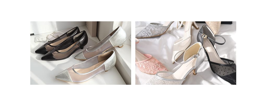 よりクラシックで落ち着いた印象を求めるなら、レースとグリッターを組み合わせた一足がおすすめ。肌に馴染む繊細なレース模様が、大人の気品漂う足元を演出。