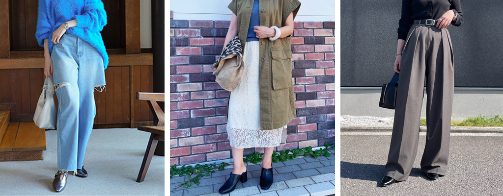 バブーシュパンプスはカジュアルなイメージがありますが、きれいめスタイルに合わせやすいデザインもたくさんあります。