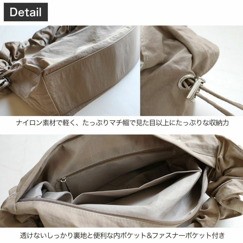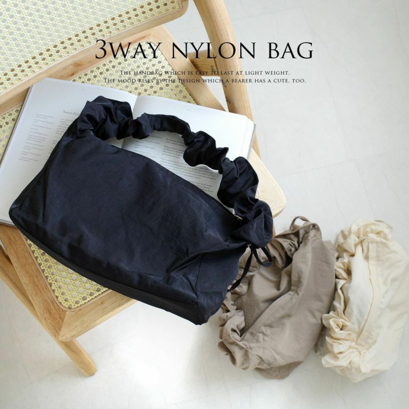 ハンドバッグとしてはもちろん、肩掛けや斜め掛けもできるのでいろんなシーンやコーデによって使い分け可能ナイロン素材で軽く、たっぷりマチで見た目以上にたっぷりな収納力も嬉しいポイント。