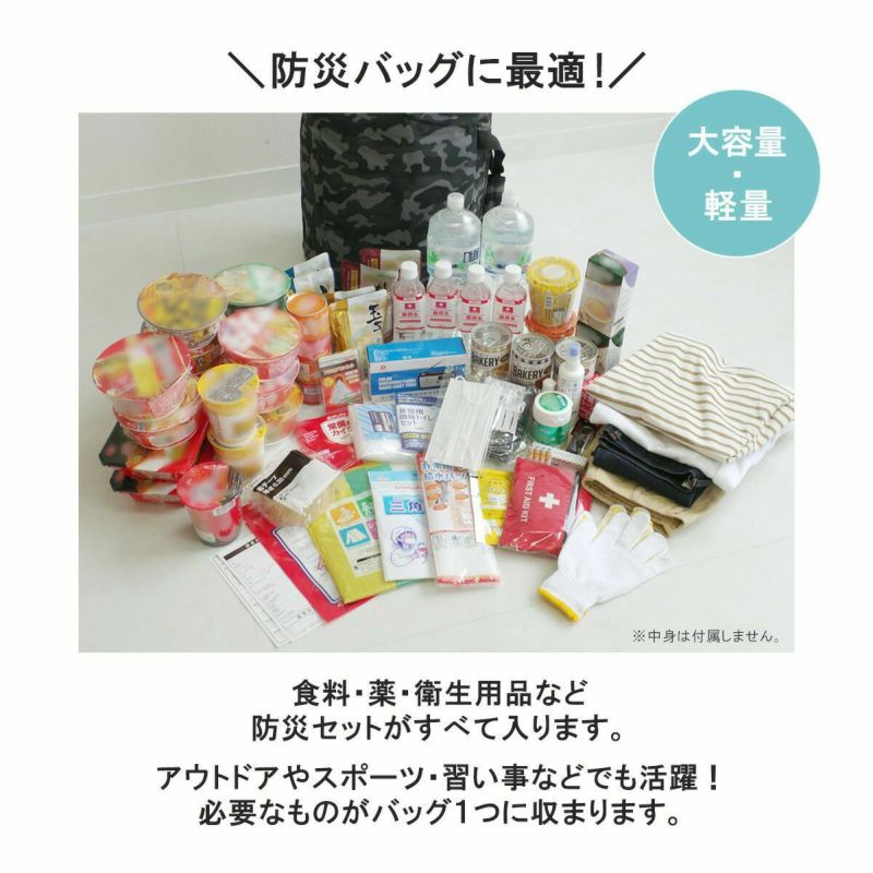大容量・軽量なので、いざという時にすぐ持ち出せます。普段はリュックやボストンとして、荷物が増えた時は大容量リュックとして使用できます。