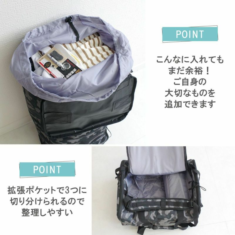 また、拡張ポケットで荷物を3つに分けることもできるので、汚れ物などを区別して収納しても◎