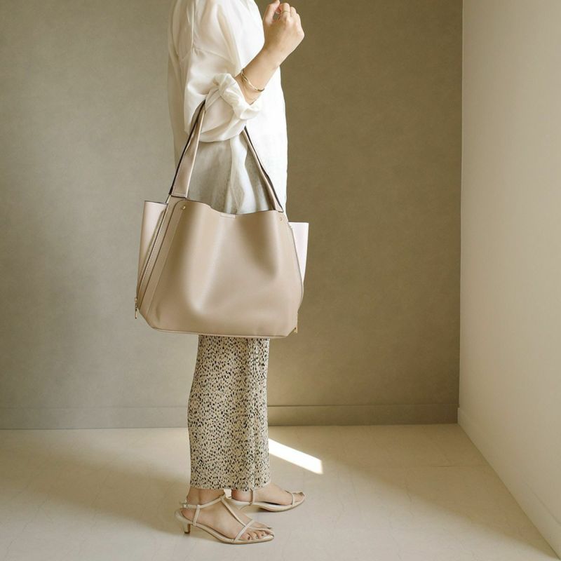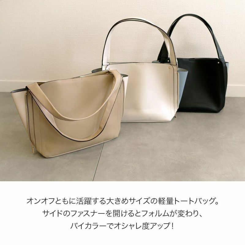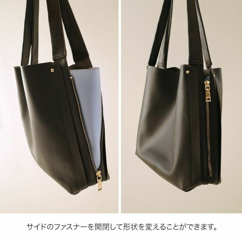 サイドのファスナーを開けるとフォルムが変わり、バイカラーでオシャレ度アップ!