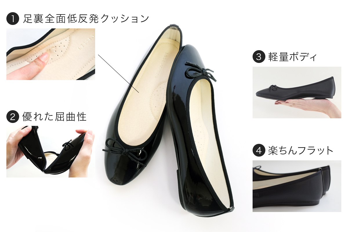 楽ちんなぺたんこバレエシューズは、長時間歩いても疲れにくいのが魅力。