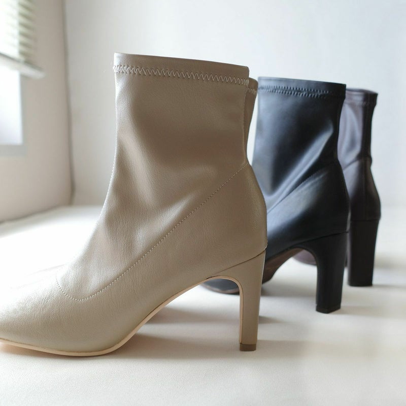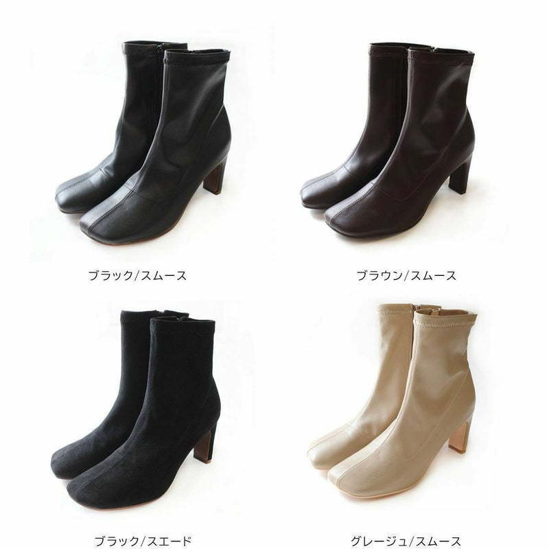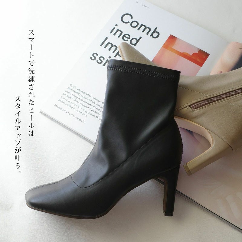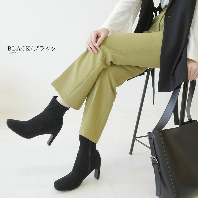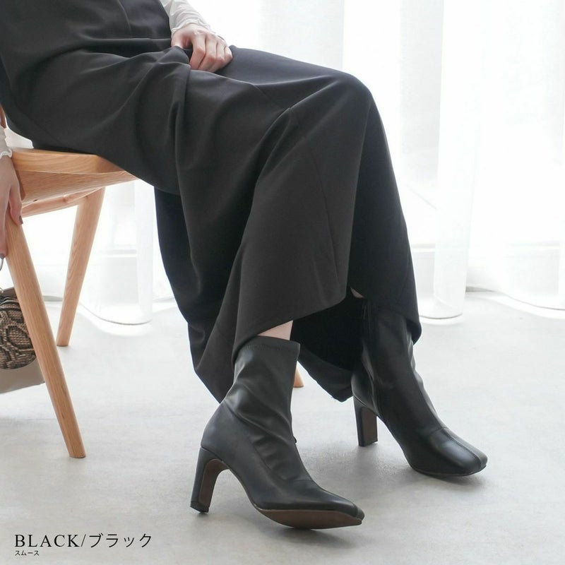 ストレッチのきいた生地が柔らかく足にほどよくフィットして細見え効果バツグン!安定感がありつつおしゃれに見える、スタイリッシュなヒールデザイン!