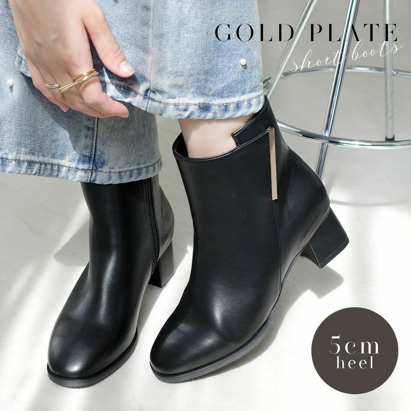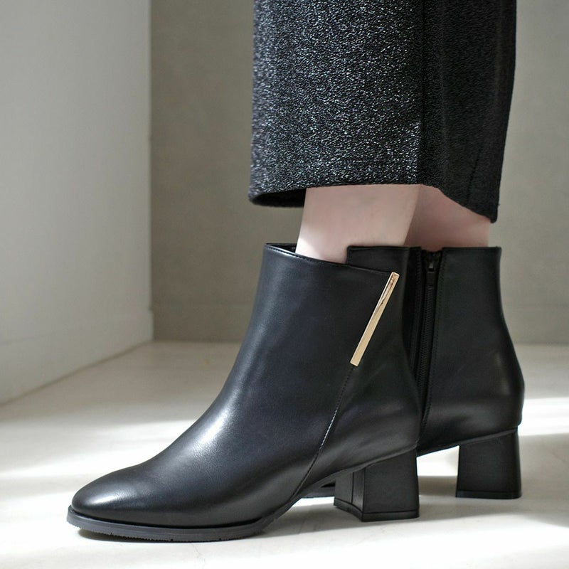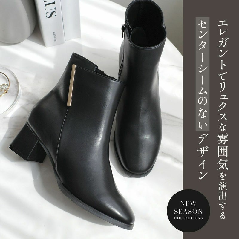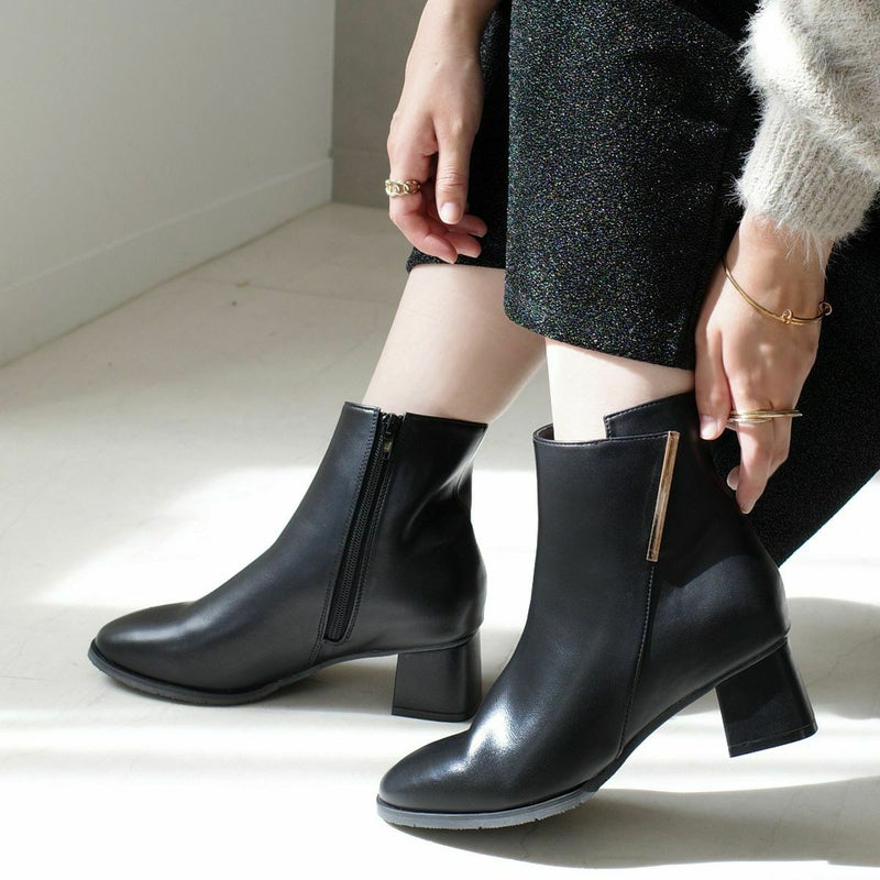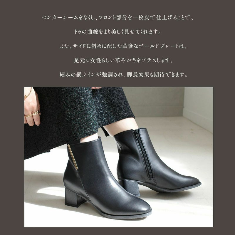 フロント部分を一枚皮で仕上げることで、トゥの曲線をより美しく見せ、エレガントでリュクスな雰囲気を演出します。また、サイドに斜めに配した華奢なゴールドプレートは、足元に女性らしい華やかさをプラスします。