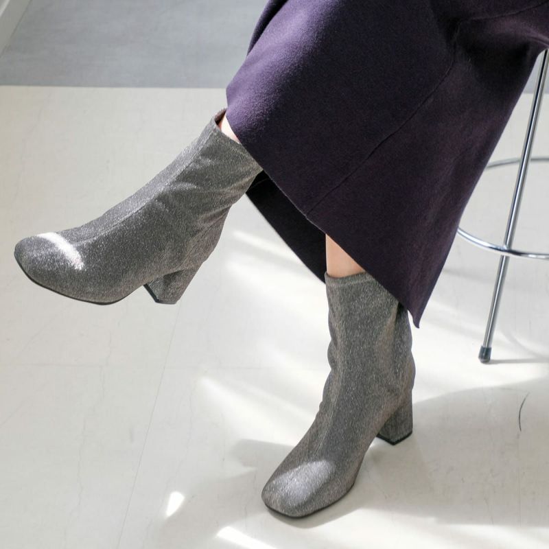 トレンドのスクエアトゥデザインと、繊細な輝きを放つラメが華やかさプラスしたショートブーツ