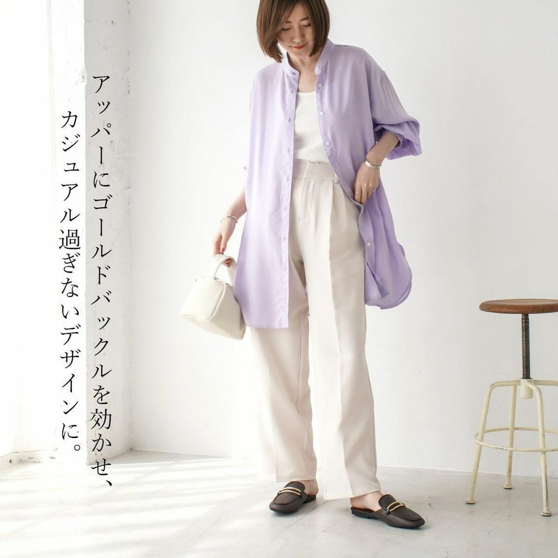 アッパーにゴールドバックルを効かせ、カジュアル過ぎないデザインに。ローヒールで楽な履き心地なのに、さっと履くだけで大人っぽい足元を作り出してくれます。