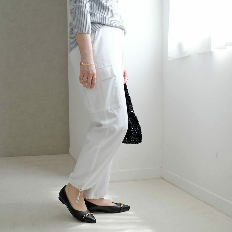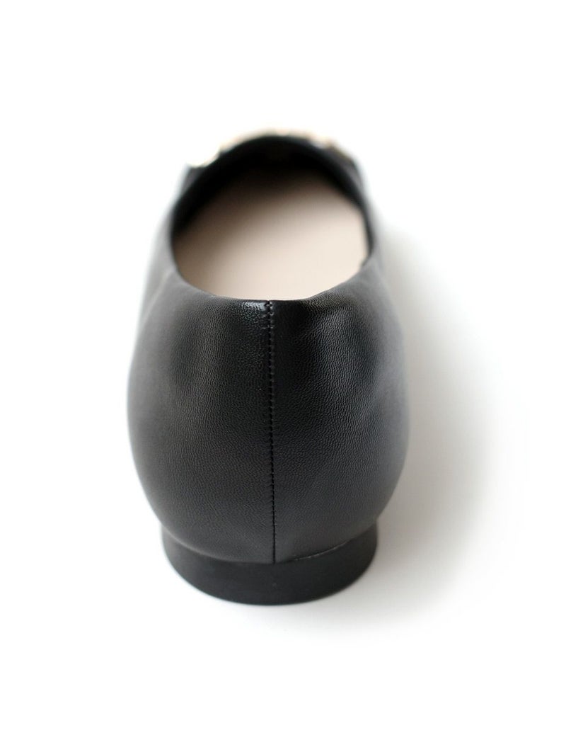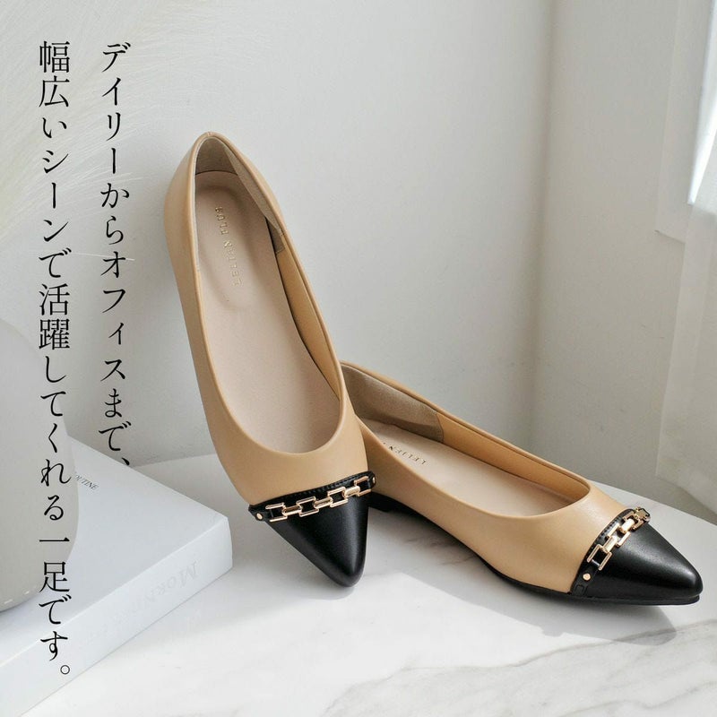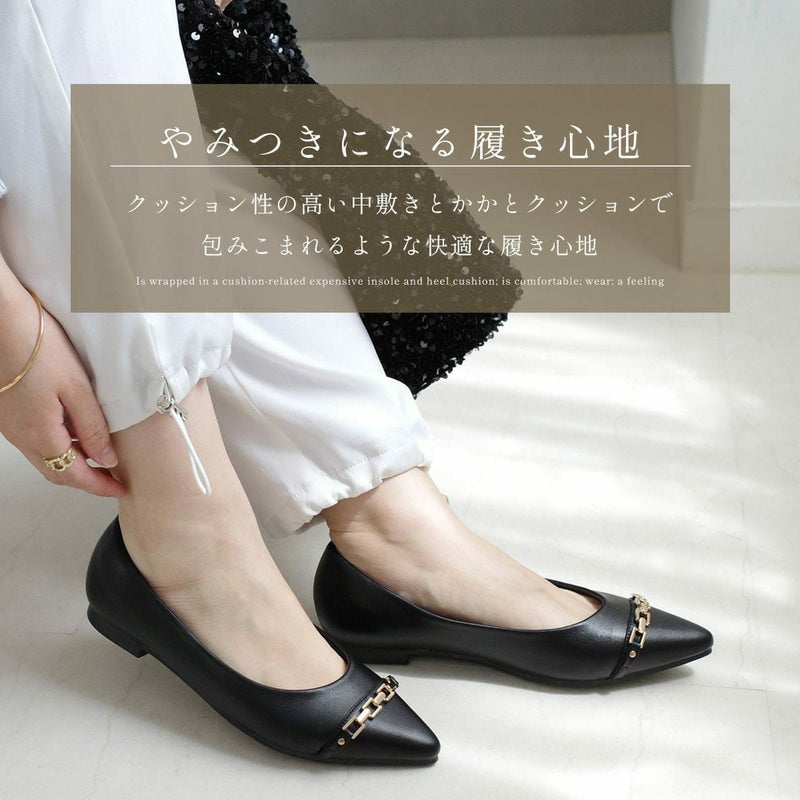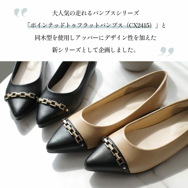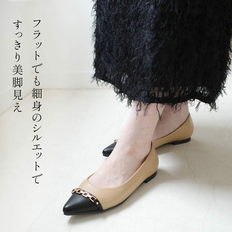 履き心地の良さと美脚シルエットで人気のパンプスと同木型を使用。デザイン性と歩きやすさを兼ね備えた1足。フラットよりも歩きやすく疲れにくい約1cmローヒールでフィット感のある優しい履き心地。