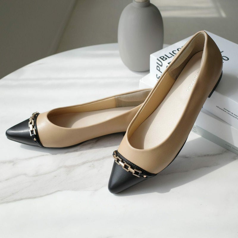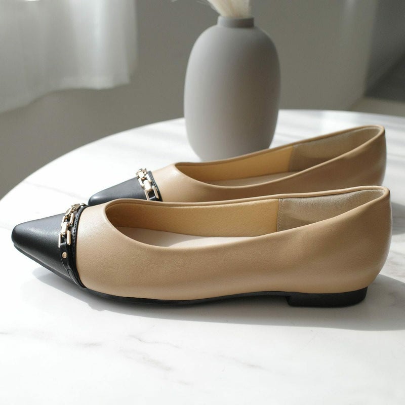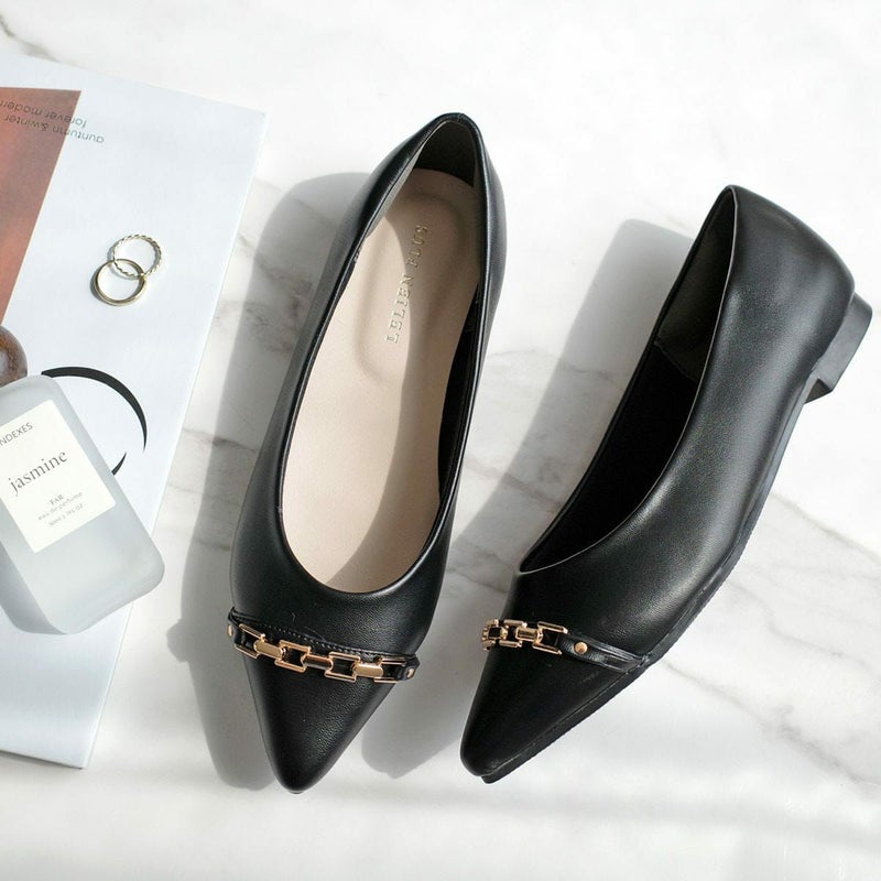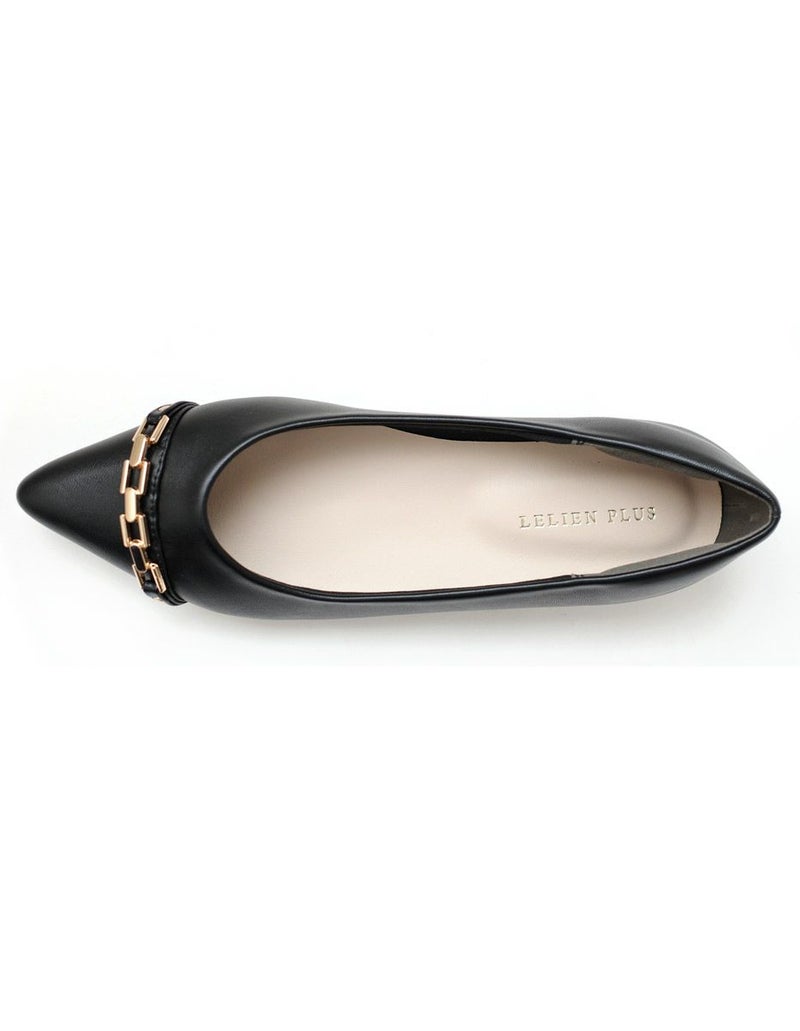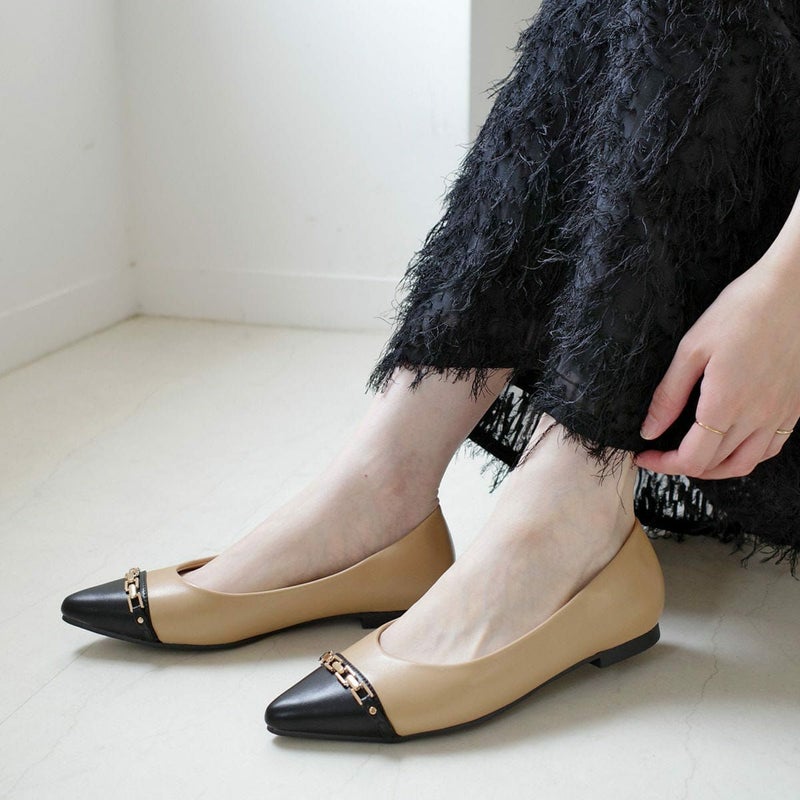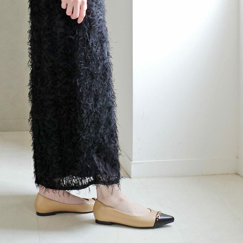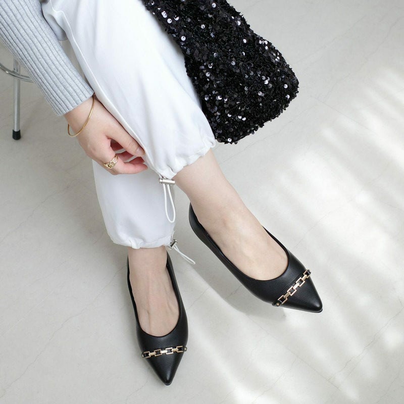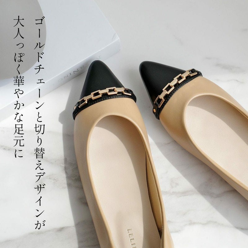 クラシカルで上品な印象のチェーンモチーフと切り替えデザインが、大人っぽく華やかな足元に。