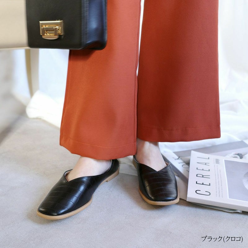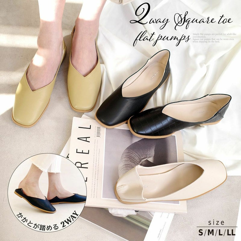かかとを踏んでも履ける2WAY仕様。スクエアトゥとコバのエッジのきいたデザインで、モードな雰囲気に。