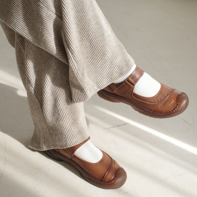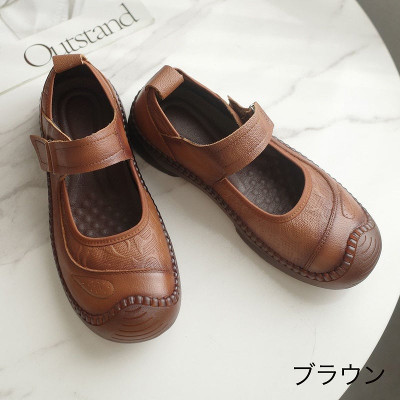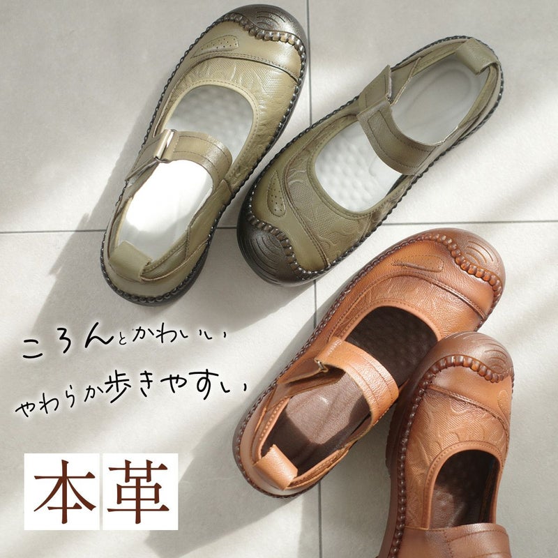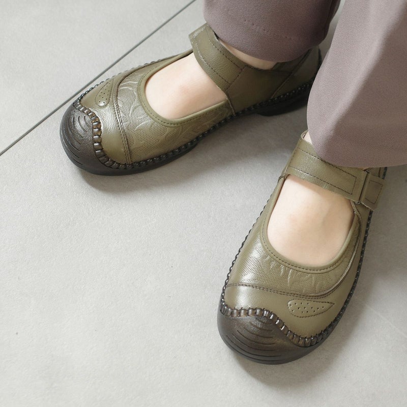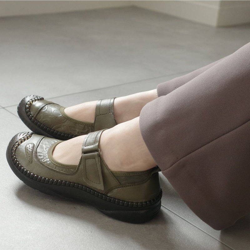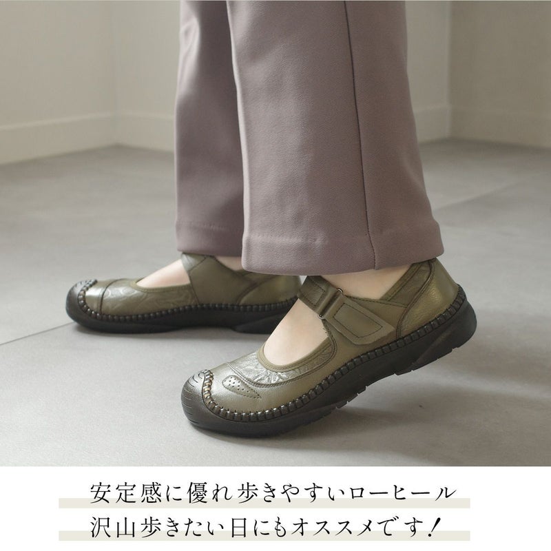 安定感のあるローヒールなので快適に歩けます。甲のベルトはマジックタイプなので調整が可能なので脱ぎ履きが楽ちん!