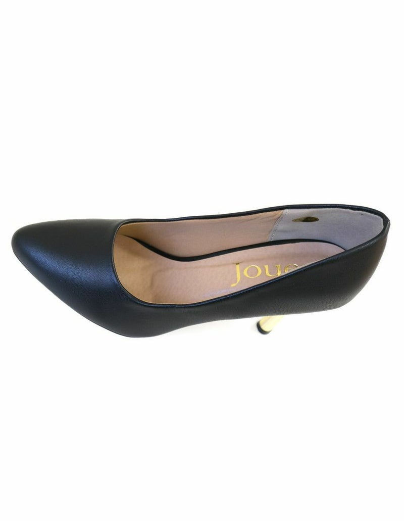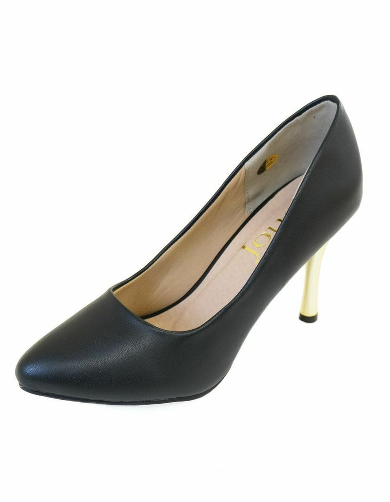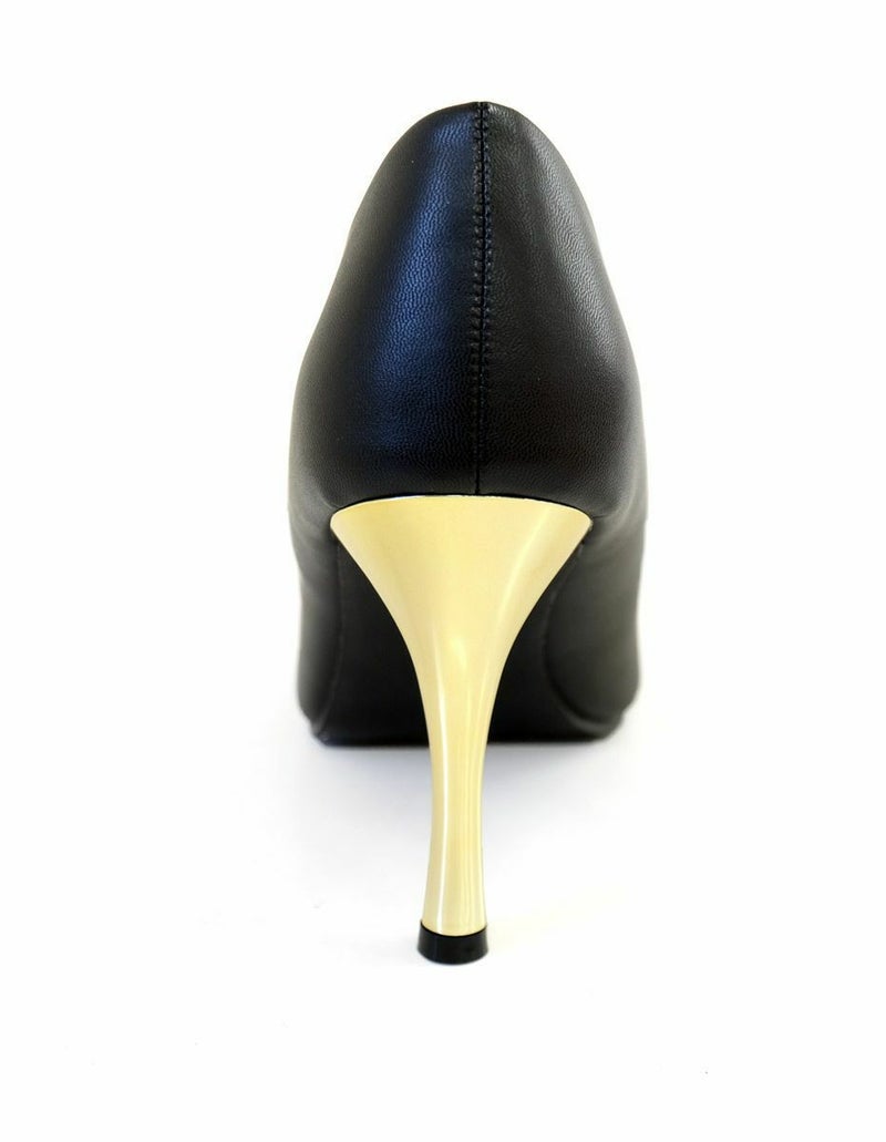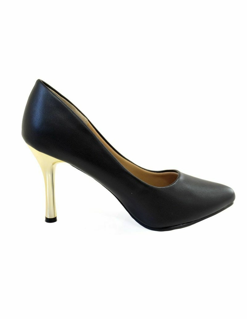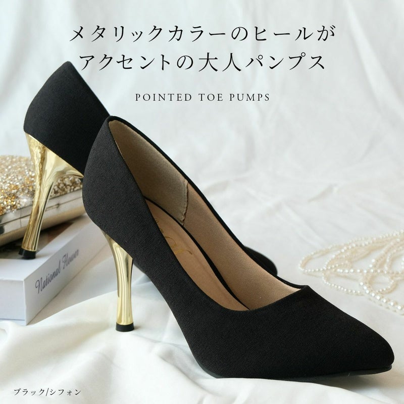 メタリックカラーのヒールがアクセントの大人パンプス