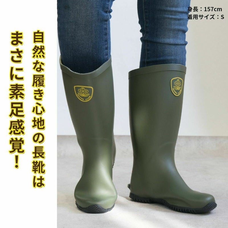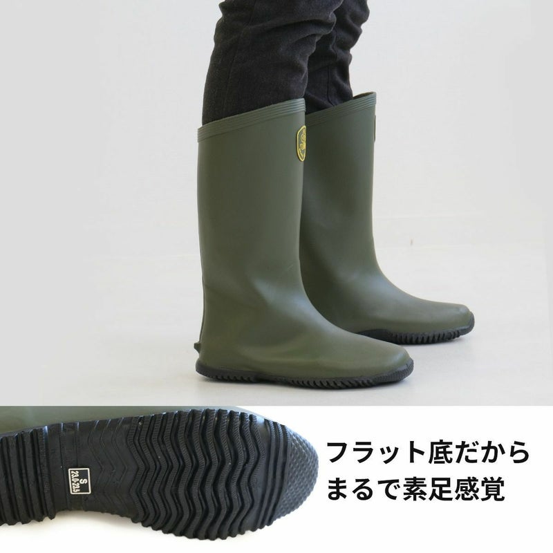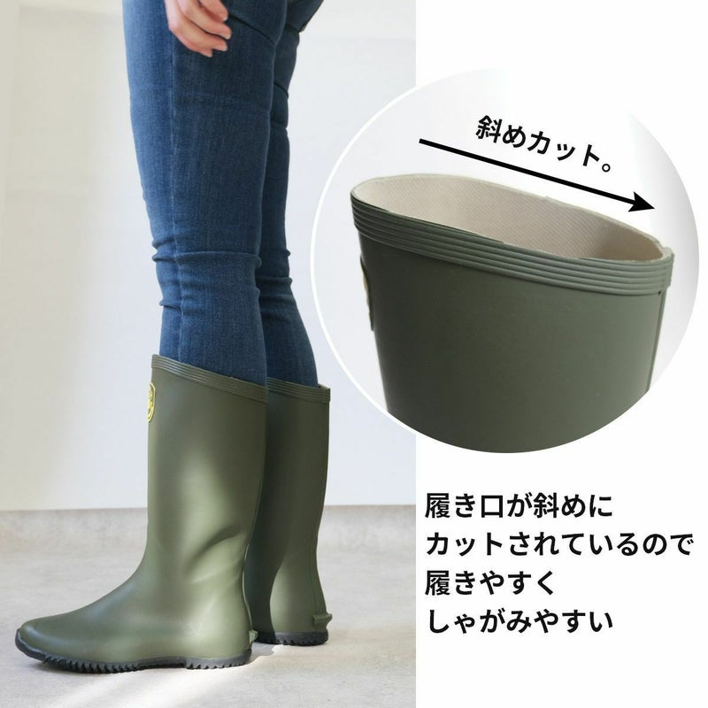 土・泥が詰まりにくいフラットソール、履きやすくしゃがみやすい履き口斜めカット自然な履き心地の長靴はまさに素足感覚。