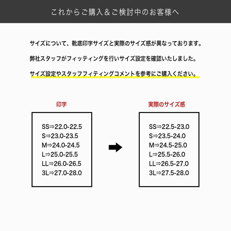 • サイズについて、靴底印字サイズと実際のサイズ感が異なっております。
