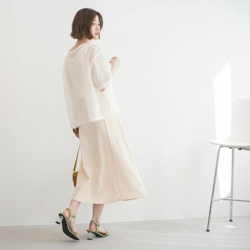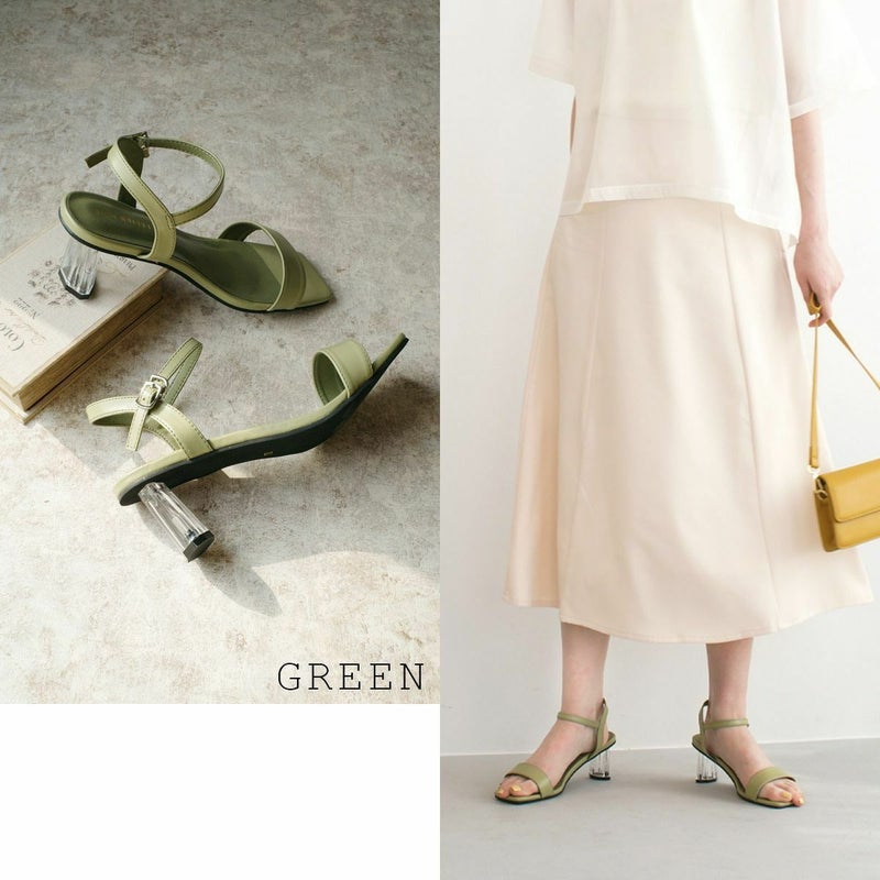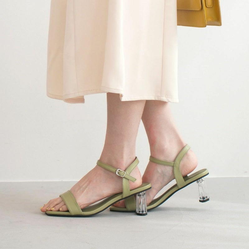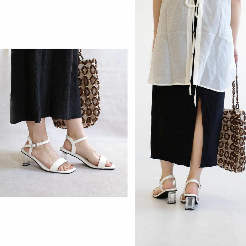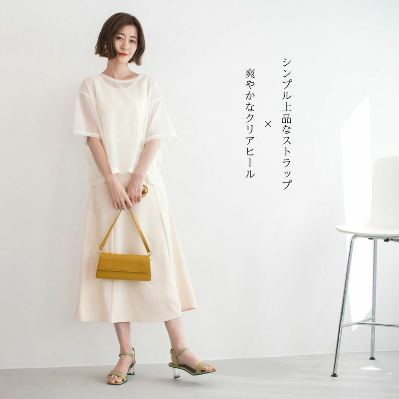 シンプルなストラップデザインで上品にまとまる。爽やかなクリアヒールで足元に抜け感を。