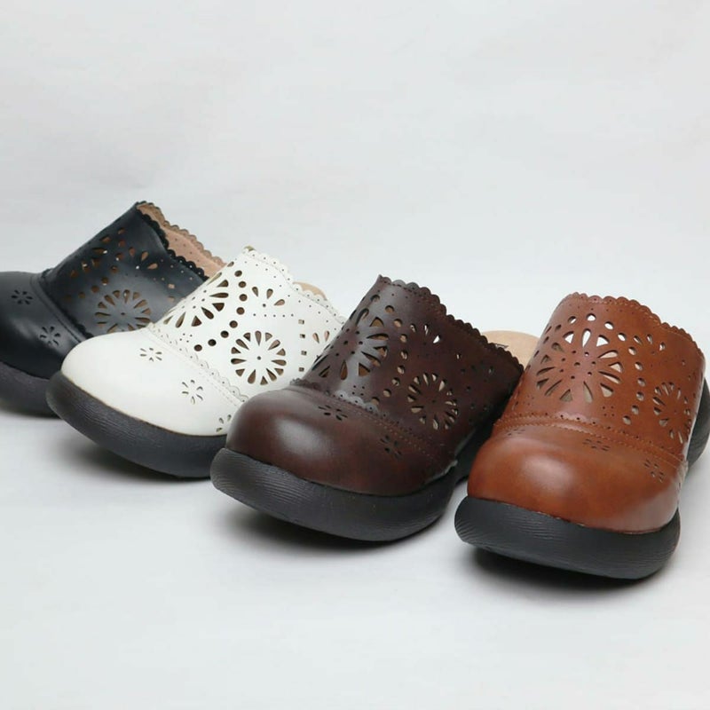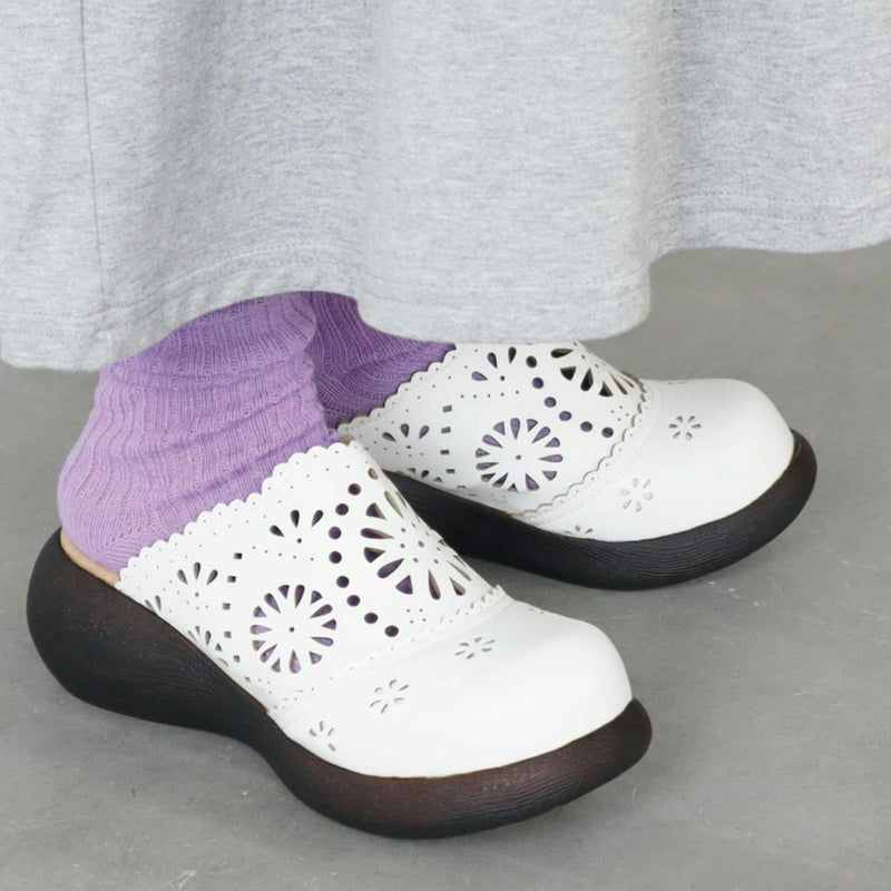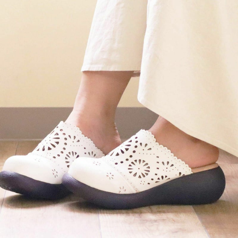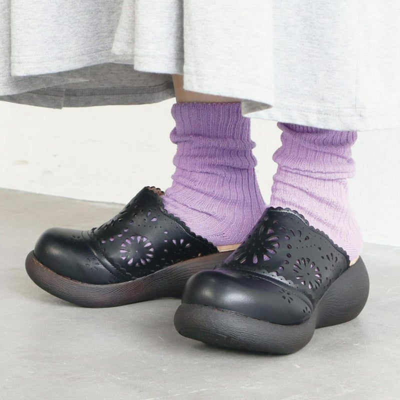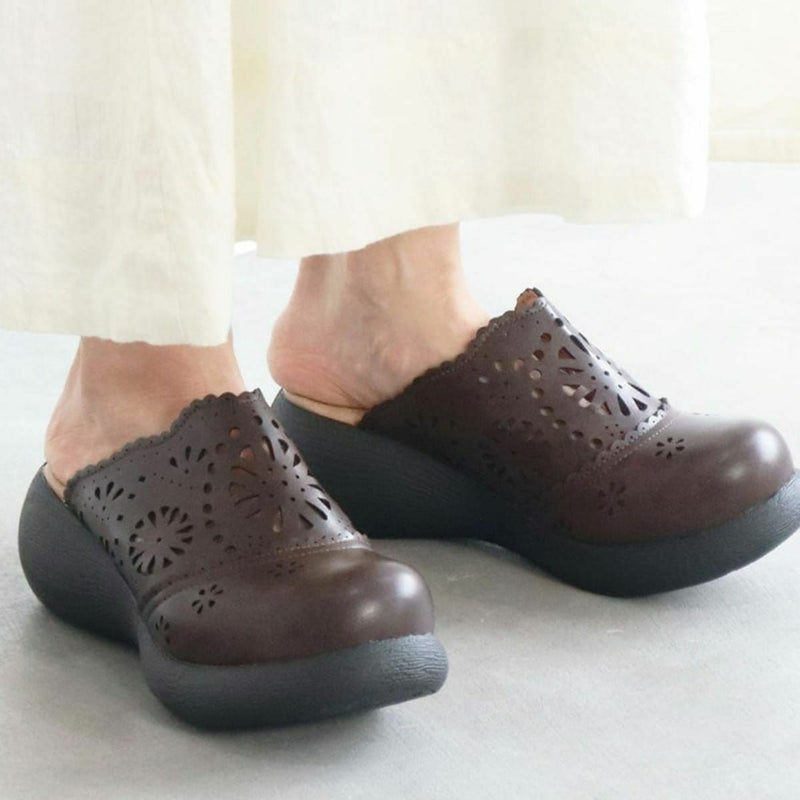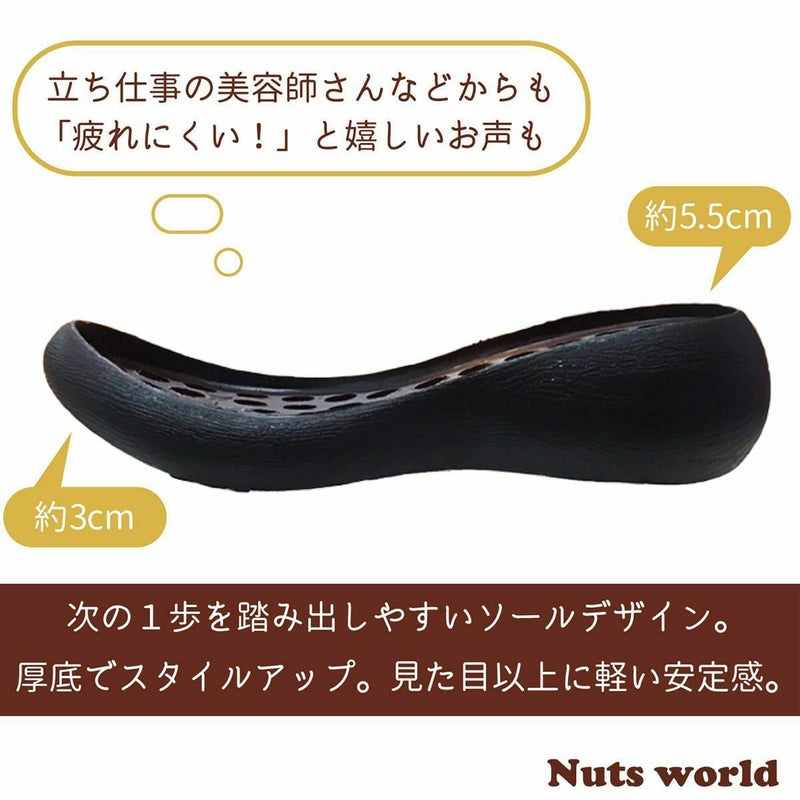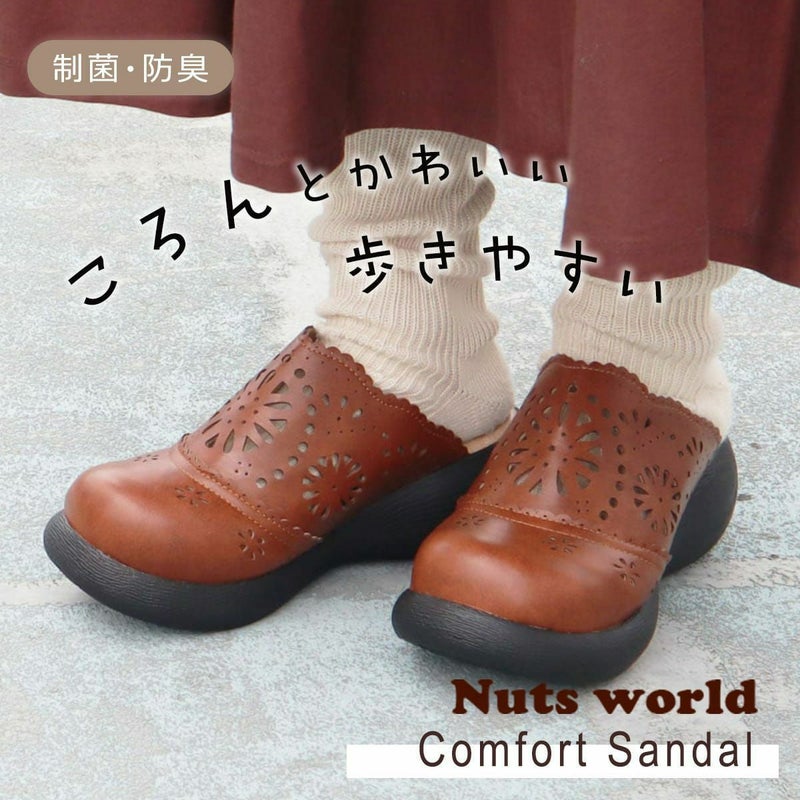 前に歩きやすい『ローリング設計』のソールがポイントです。ころんとかわいい + 歩きやすい “Nutsソール” を使ったサボサンダル。