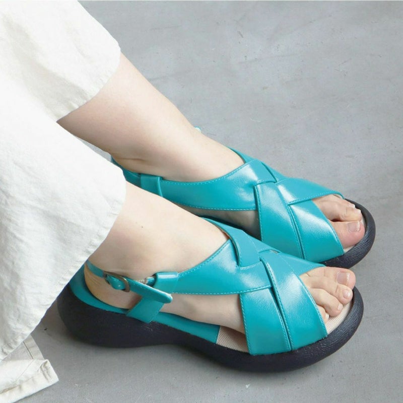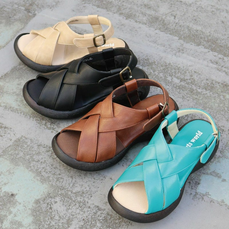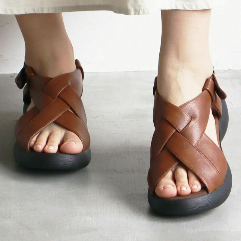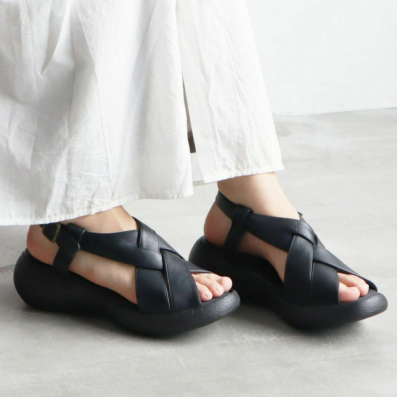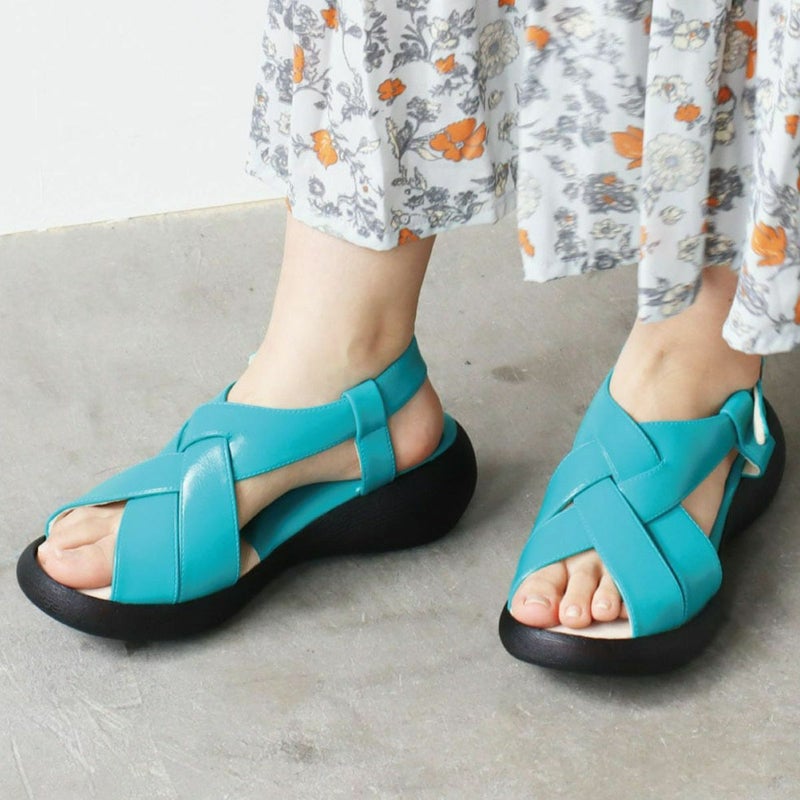 前に歩きやすい『ローリング設計』のソールがポイントです。ナチュラルな雰囲気ながら太めのクロスベルトがエレガントに足を美しく見せてくれます。
