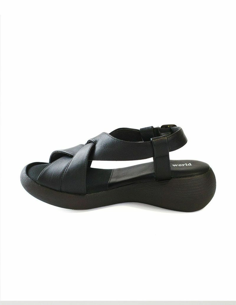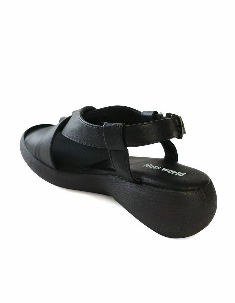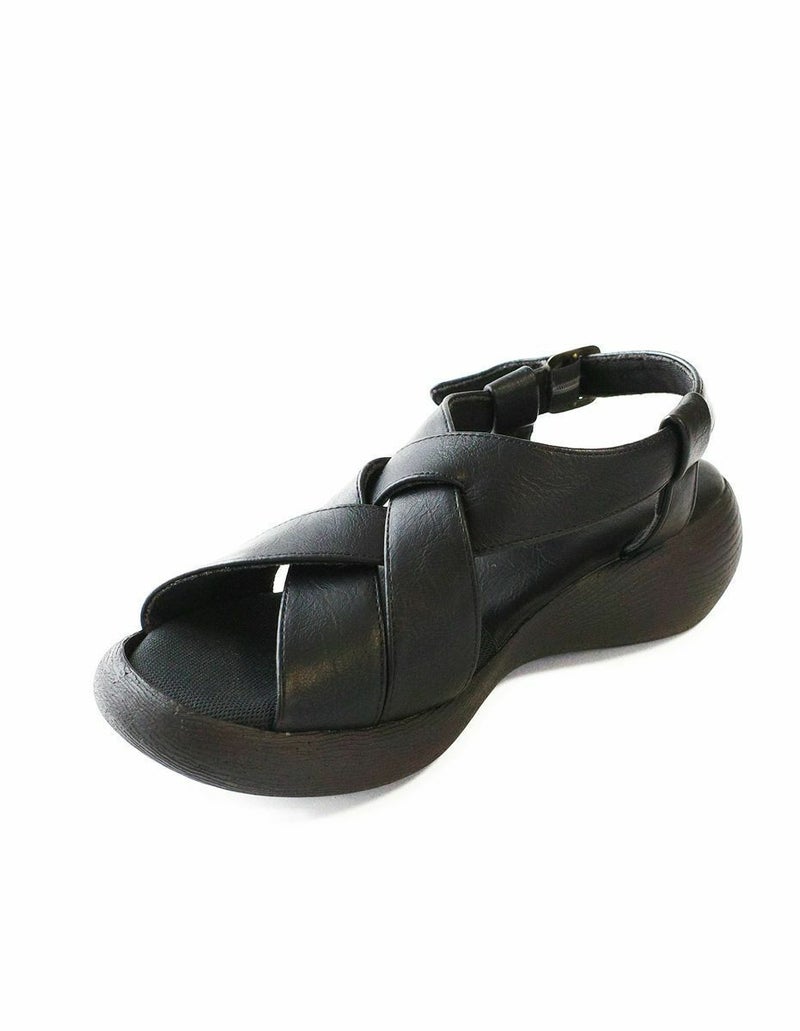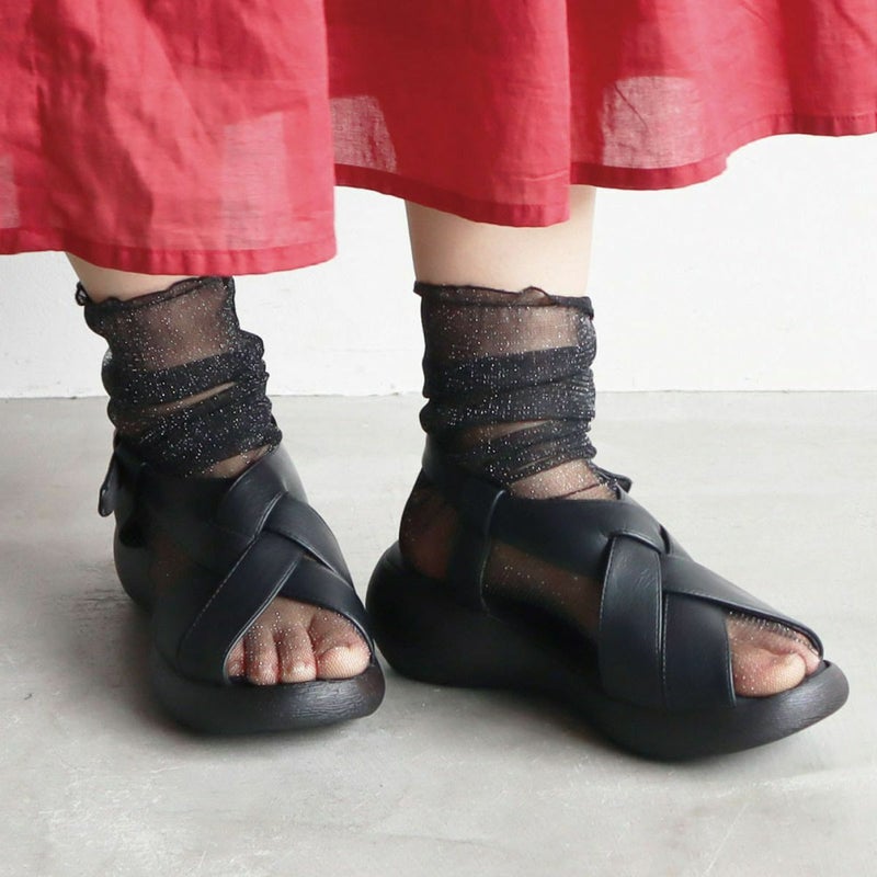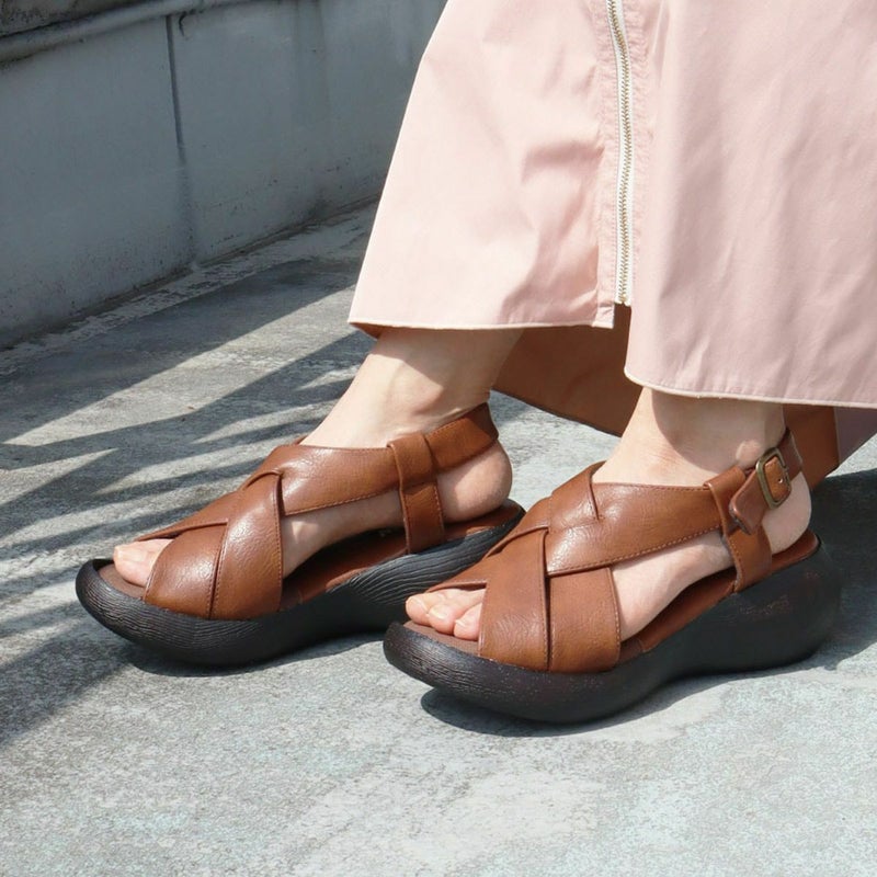 前に歩きやすい『ローリング設計』のソールがポイントです。ナチュラルな雰囲気ながら太めのクロスベルトがエレガントに足を美しく見せてくれます。