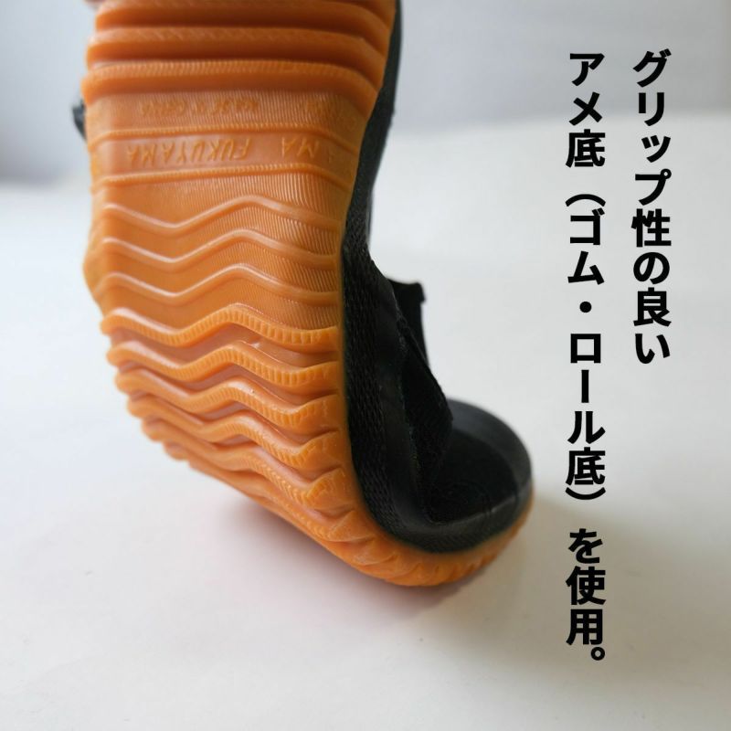 すべりにくいゴム底。抗菌防臭加工中敷き使用。足袋の様な履き心地で足になじむ快適シューズ。通気性も抜群。