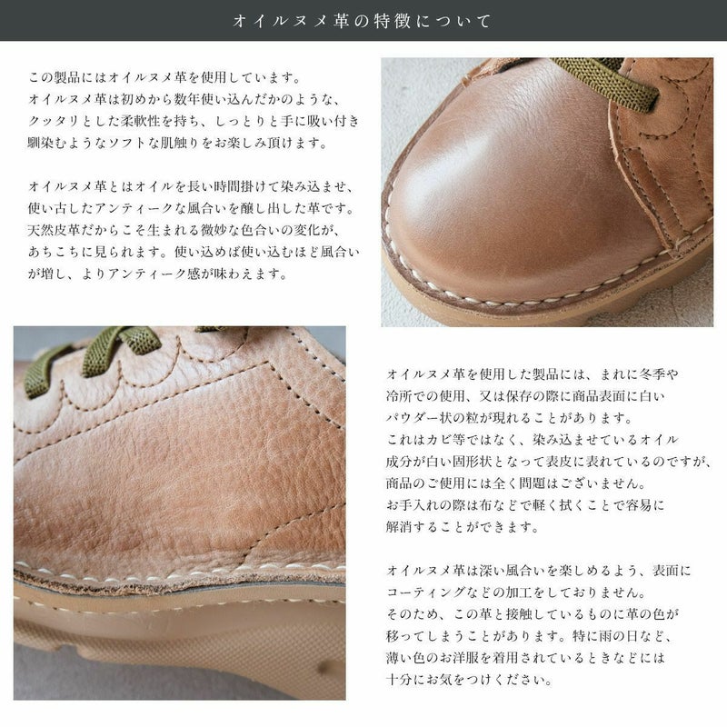 • オイル革のお手入れについては、表面が乾いてツヤがなくなり気味の時は市販のミンクオイル、又は無色の皮革用ワックスなどを全体にぬり込んでください。その後は布で乾拭きすることをお勧めします。