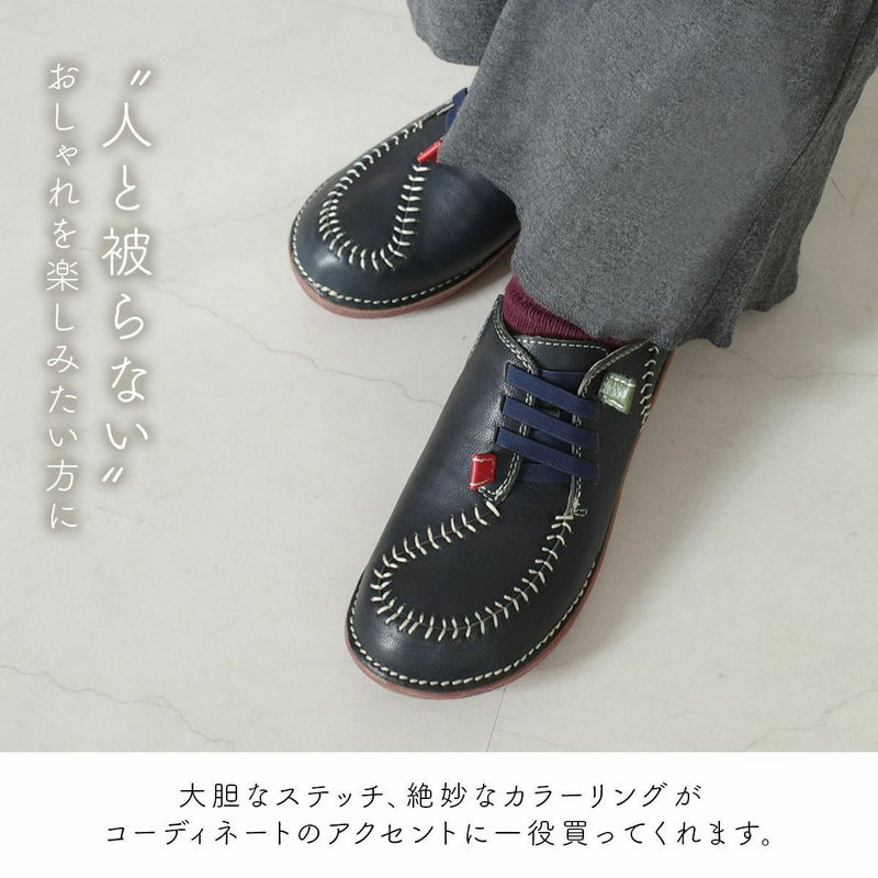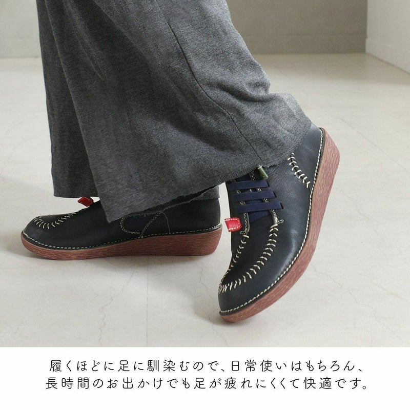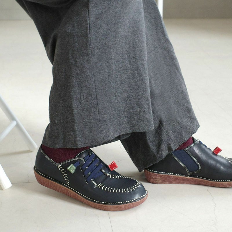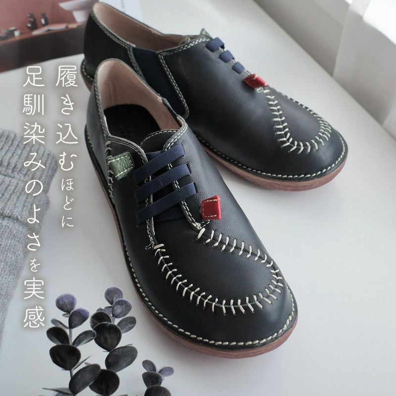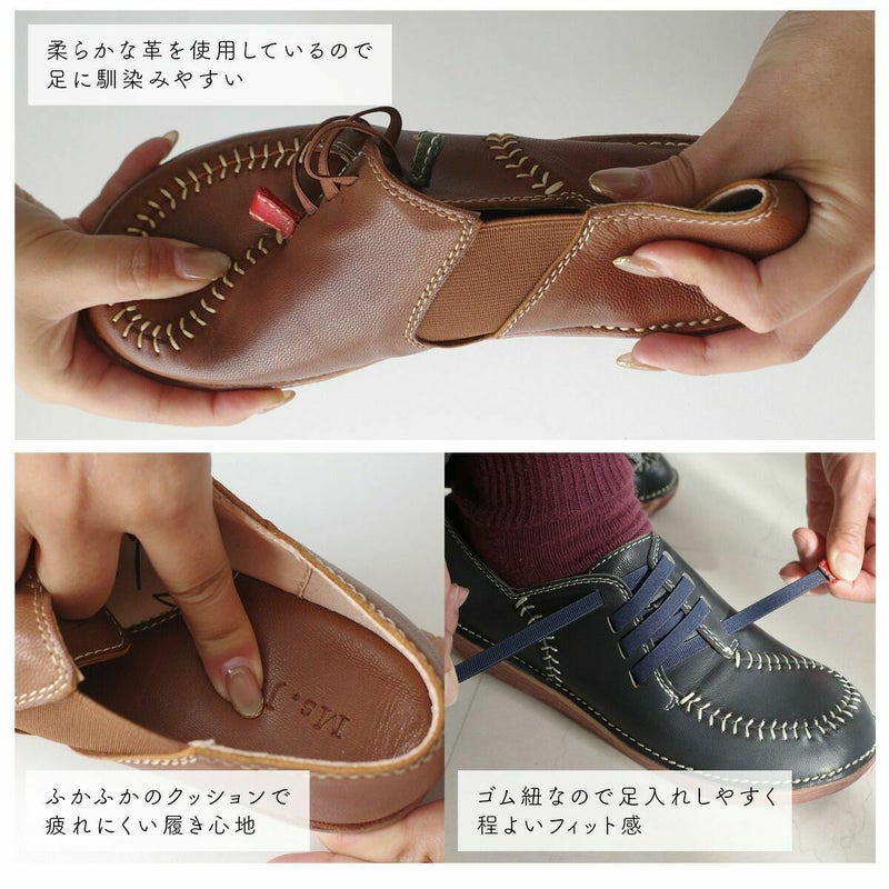 足馴染みの良いやわらかな本革製で、心地よいフィット感。インソールもふかふかクッションで快適です。ゴム紐とサイドゴア付きで脱ぎ履きしやすく、さっと足入れできて楽ちんです。