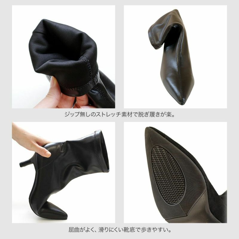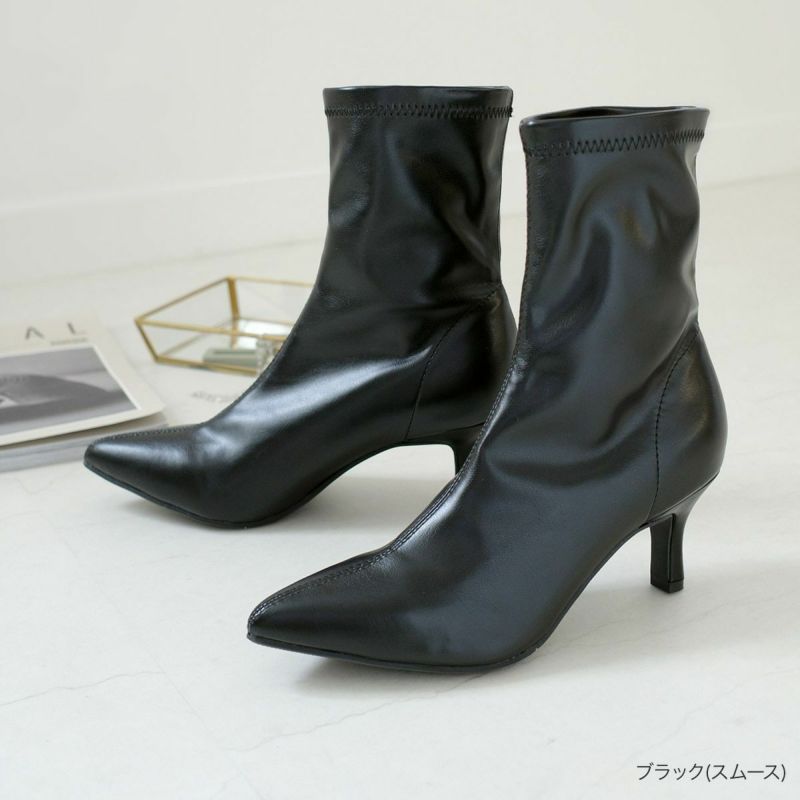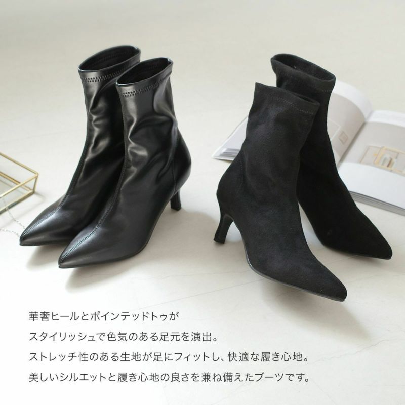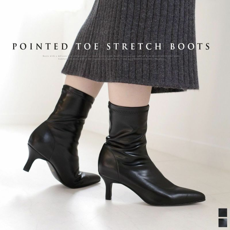 シルエットにこだわったヒールブーツ。華奢なヒールとポインテッドトゥが大人っぽい。ジップなしのストレッチ素材で脱ぎ履きがラク。