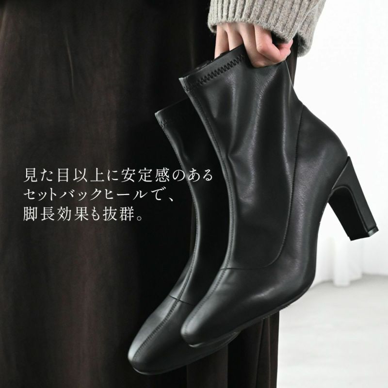 見た目以上に安定感のある8cmセットバックヒールで、脚長効果も抜群。足の動きにほどよくフィットするストレッチ素材を採用!