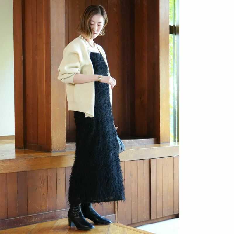 同色のワイドパンツとブーツでつなげたスタイルアップコーデがオススメです。