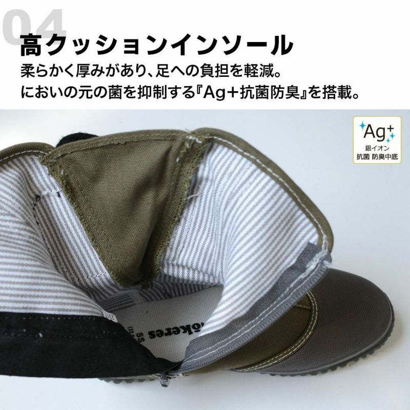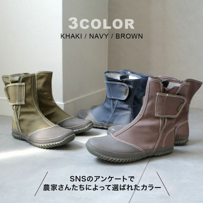 マジックバンドで履き口のサイズ調整が可能なので、個々の足に合わせられフィット感抜群。撥水加工が施されており、雨をはじき汚れなどがつきにくい。