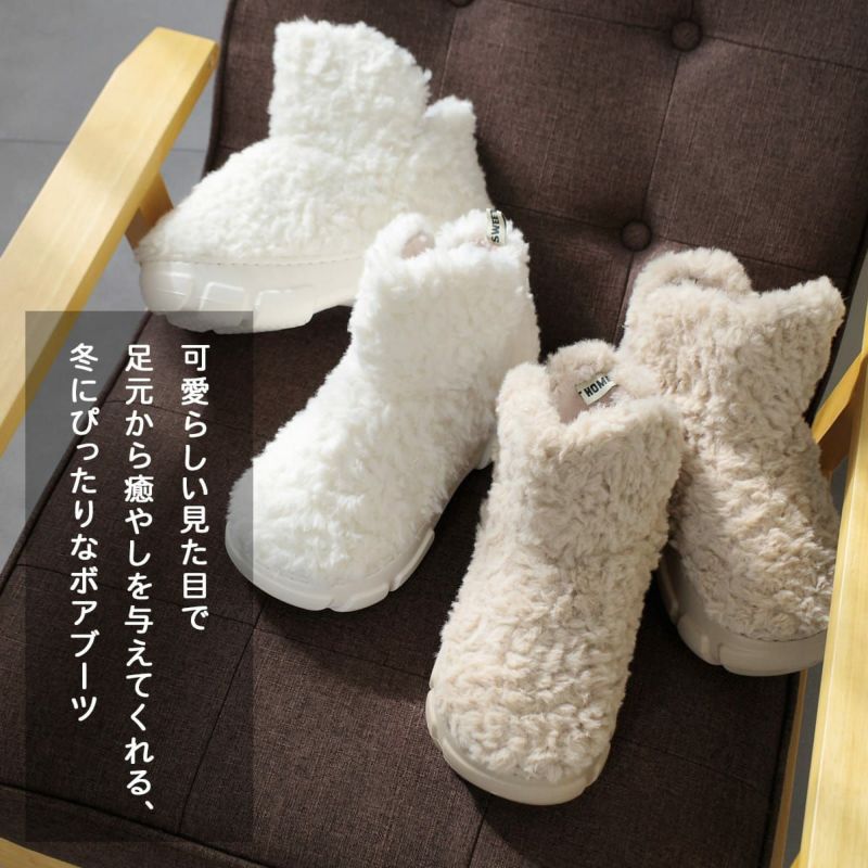 全体を覆うもこもことしたボア素材が、足元からしっかり暖かさをキープします。ボリュームのある厚底ソールは軽量で安定感があり、デイリーユースはもちろん、ちょっとしたお出かけにもぴったり。
