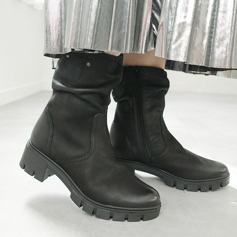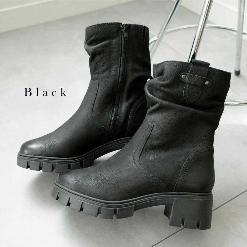 くしゅっとした自然なシワがポイントのミドルブーツ。内側のファスナーや足あたりのいい内張など、履きやすさにもこだわっています。