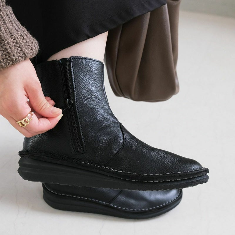 内側ファスナー仕様で脱ぎ履きも楽ちん。疲れにくいかかとの高さに加えて、つま先の付け根が痛くなりにくい底の厚みです。