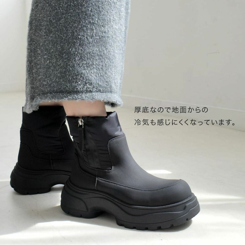 筒周りはすっきりとしているのでボリューム感にメリハリもあり、大人っぽい厚底ブーツとなっています。