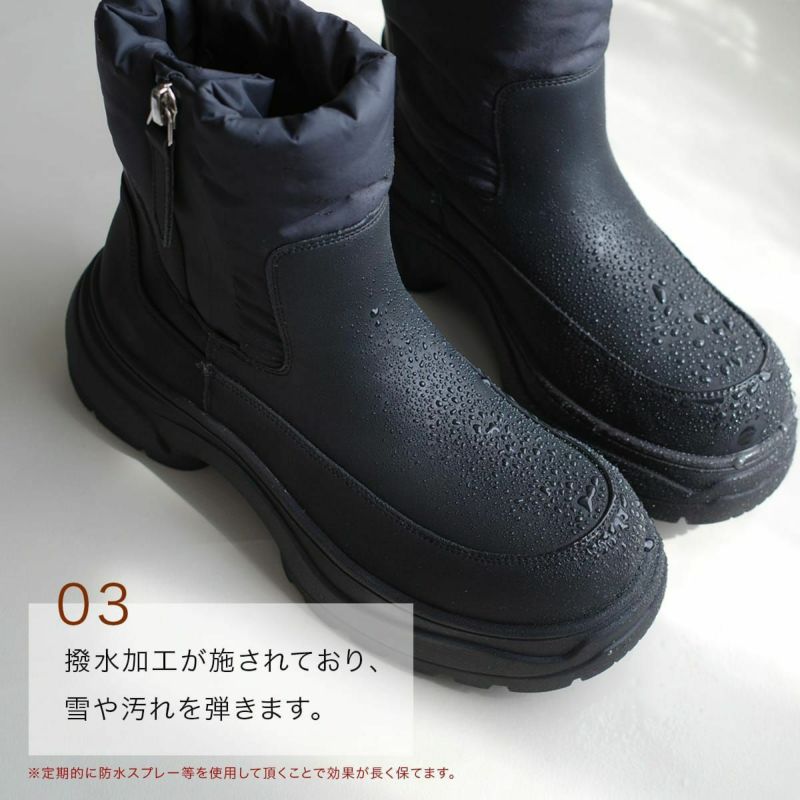 アッパーには撥水加工、防滑ソールで雪の日も対応!内側ファー仕様でつま先まであったかい!履き口を中綿にすることで、ショートブーツにありがちな足のすねの擦れを軽減し、ノンストレスな履き心地となっています。
