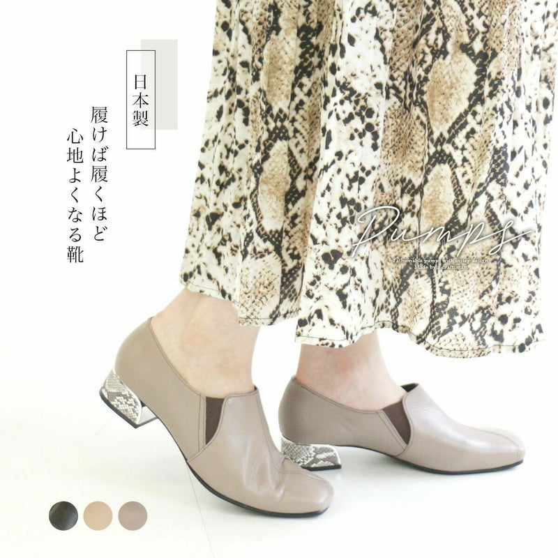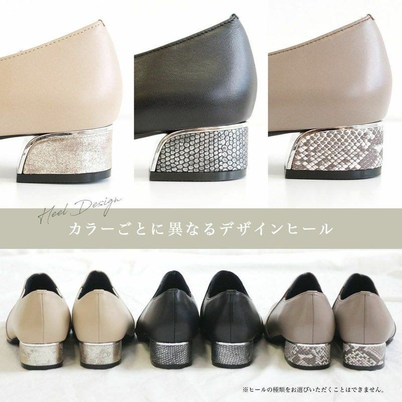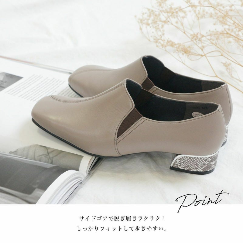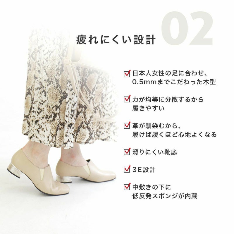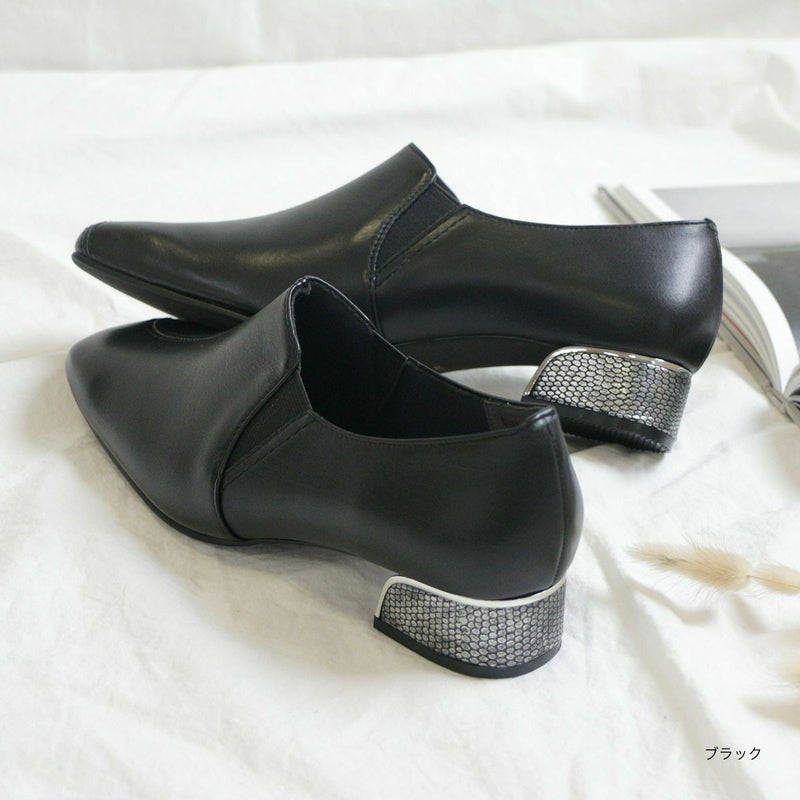 サイドゴアと甲深デザインでしっかり足にフィットします。ヒールは3.5cmと歩きやすい高さで、メタルパーツが上品に光ります。
