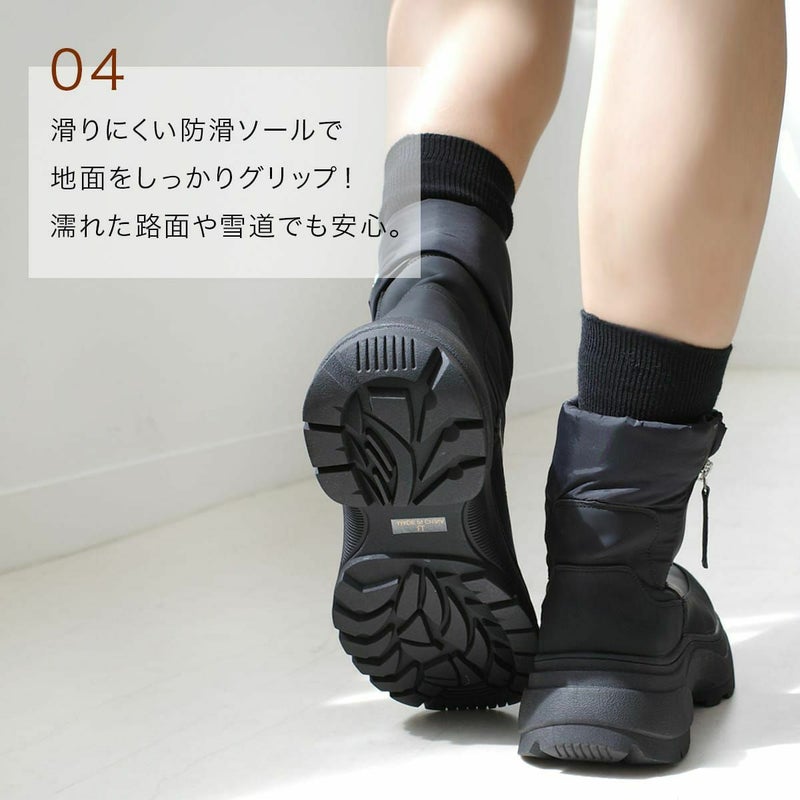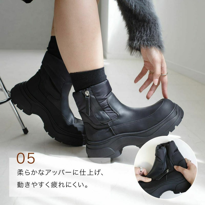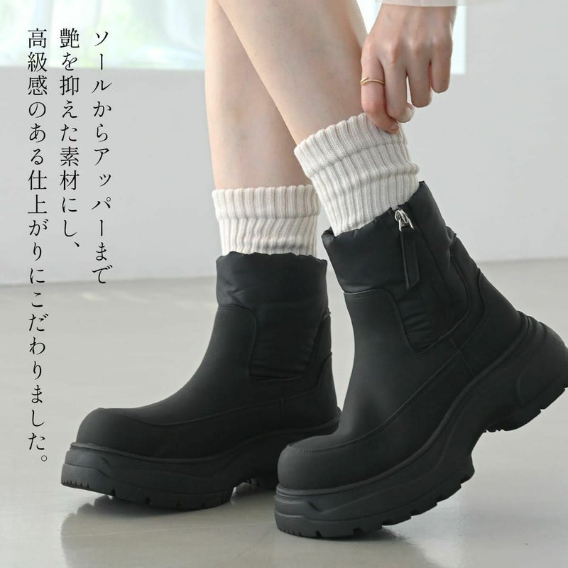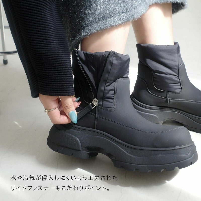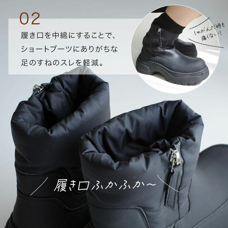 アッパーには撥水加工、防滑ソールで雪の日も対応!内側ファー仕様でつま先まであったかい!履き口を中綿にすることで、ショートブーツにありがちな足のすねの擦れを軽減し、ノンストレスな履き心地となっています。
