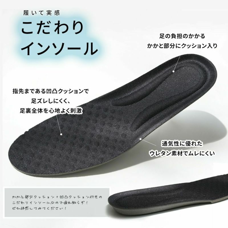 かかと部分クッション+凹凸クッション付きのこだわりのインソールを採用。