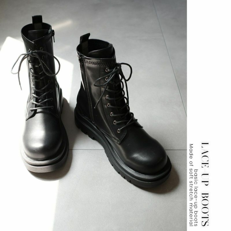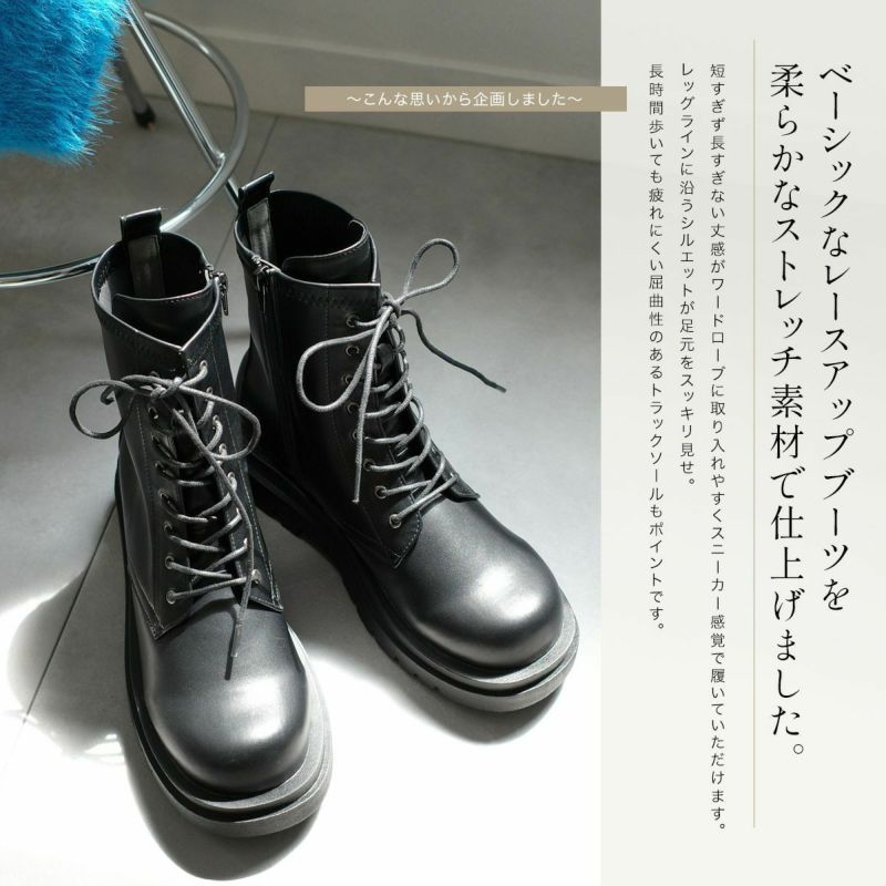 ベーシックなレースアップブーツを柔らかなストレッチ素材で仕上げました。