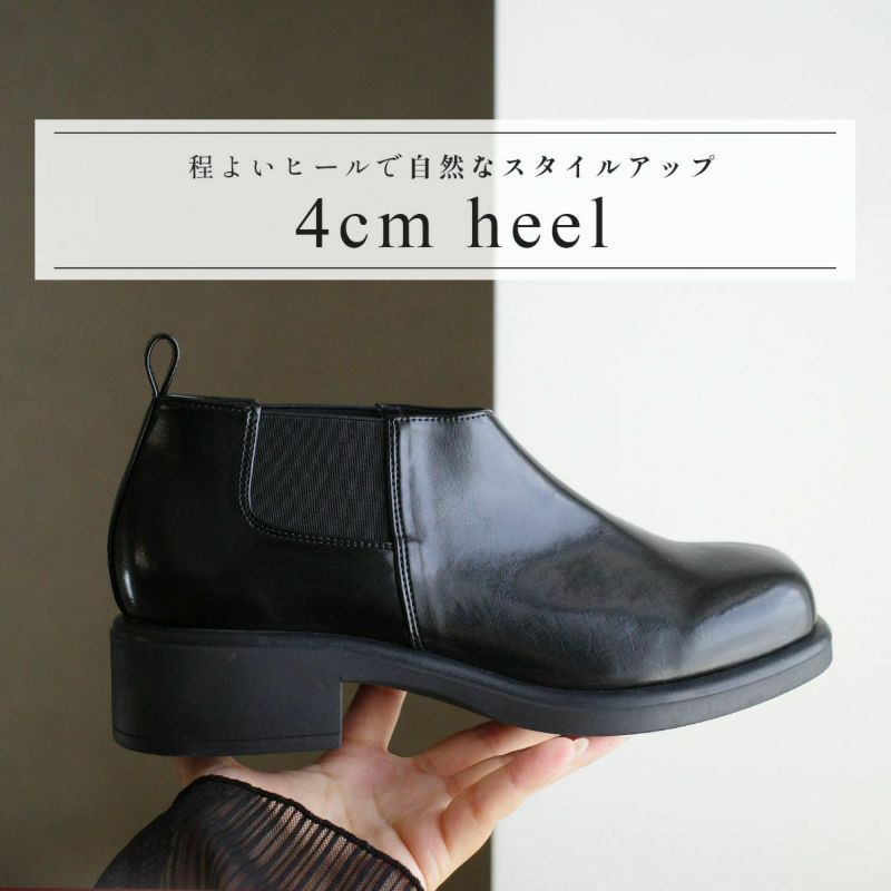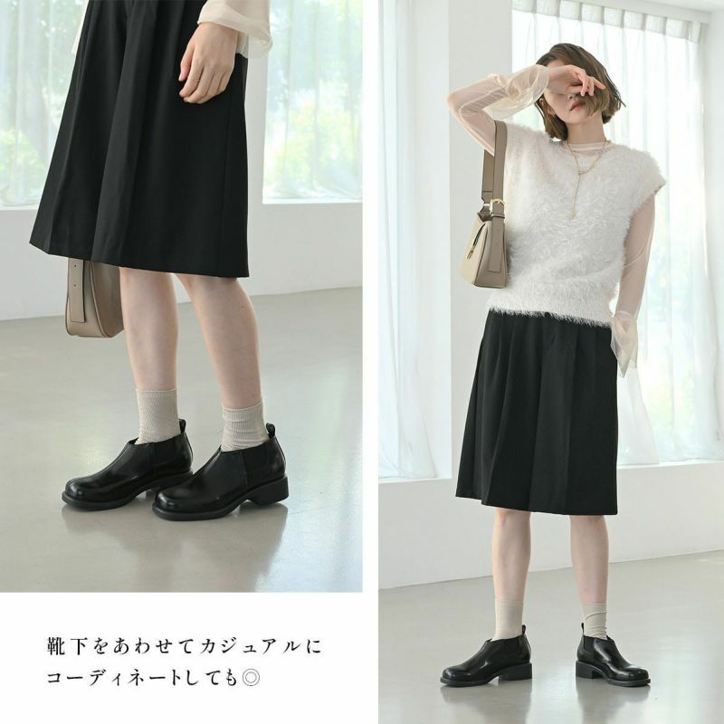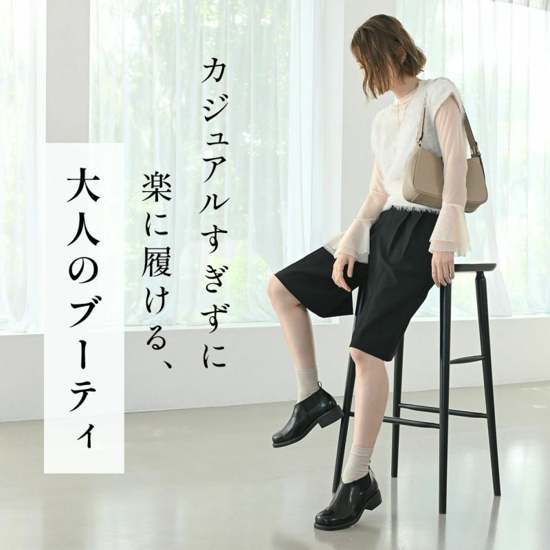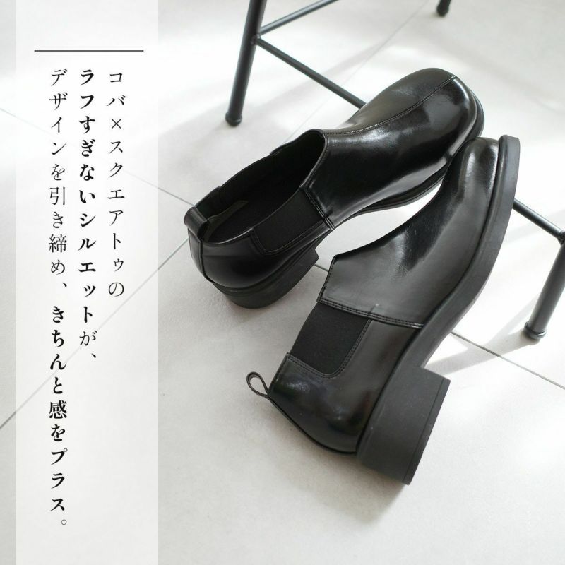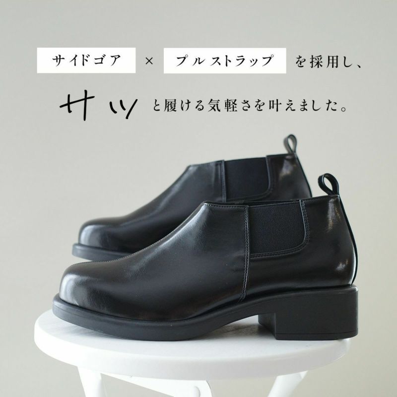 サイドゴアやプルストラップを採用しサッと履ける気軽さを叶えました。コバとスクエアトゥでデザインを引き締め、きちんと感もプラス。