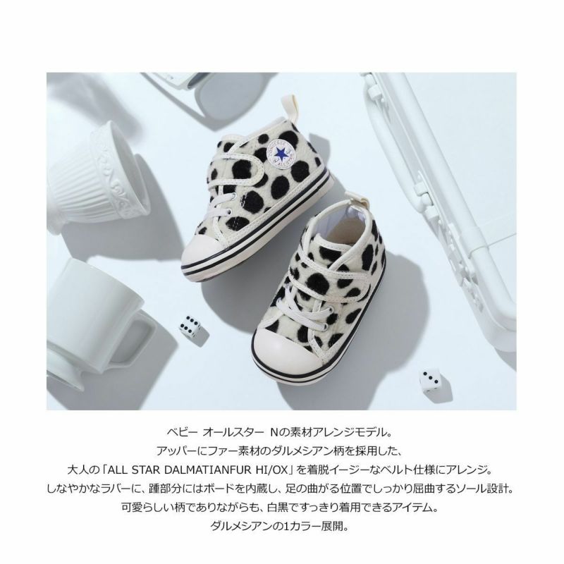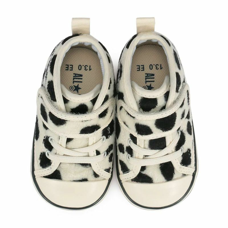 アッパーにファー素材のダルメシアン柄を採用。大人の「ALL STAR DALMATIANFUR HI/OX」を着脱イージーなベルト仕様にアレンジ。