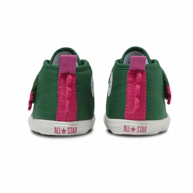 ベビーのアパレルでも人気の恐竜をモチーフとしたアイテム。恐竜の特徴的な骨板を踵にギザギザで表現し、ベルト部分は爪を付けて前足を表現。