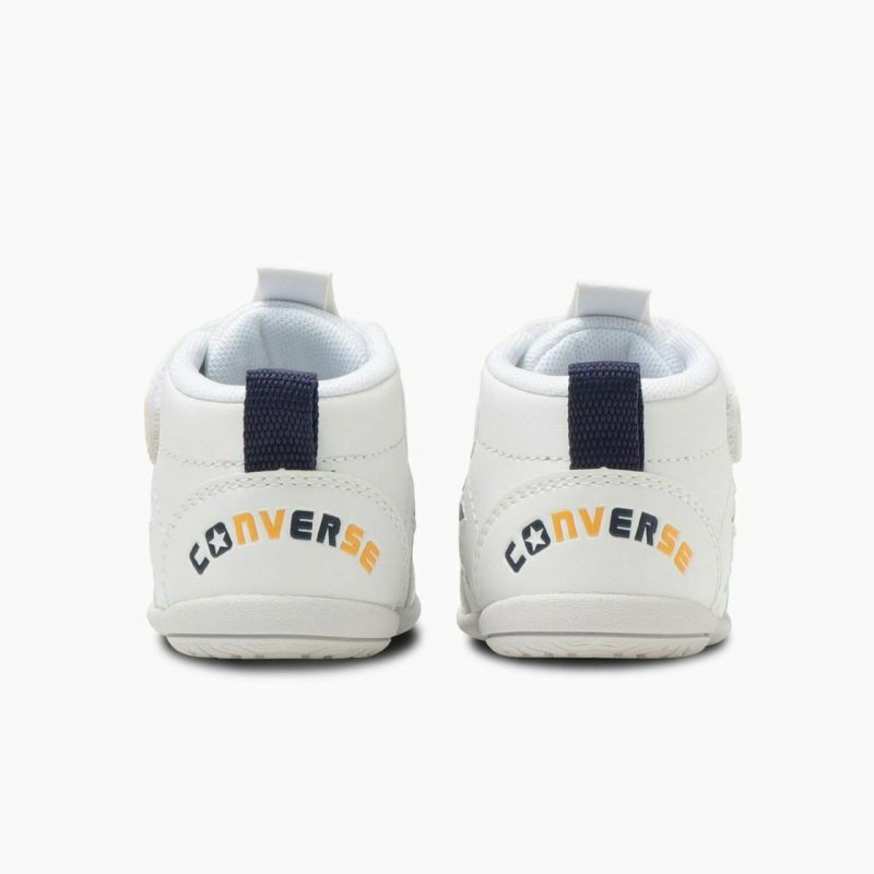 不安定なベビーの足元をやさしくサポートするインファント向けのミッドカットモデル。アッパーにはソフトなシンセティックレザーを採用。