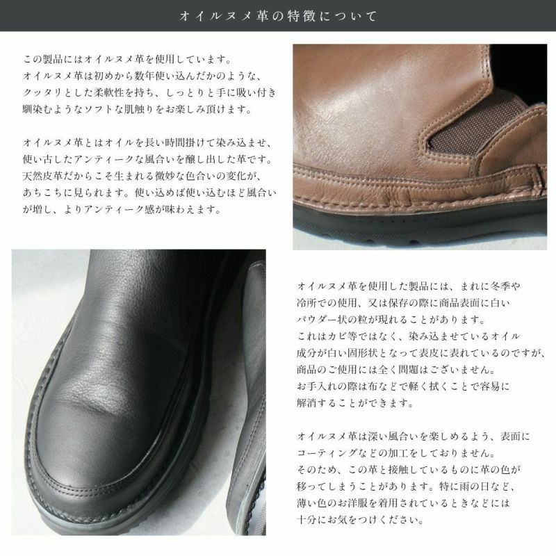 • オイル革のお手入れについては、表面が乾いてツヤがなくなり気味の時は市販のミンクオイル、又は無色の皮革用ワックスなどを全体にぬり込んでください。その後は布で乾拭きすることをお勧めします。