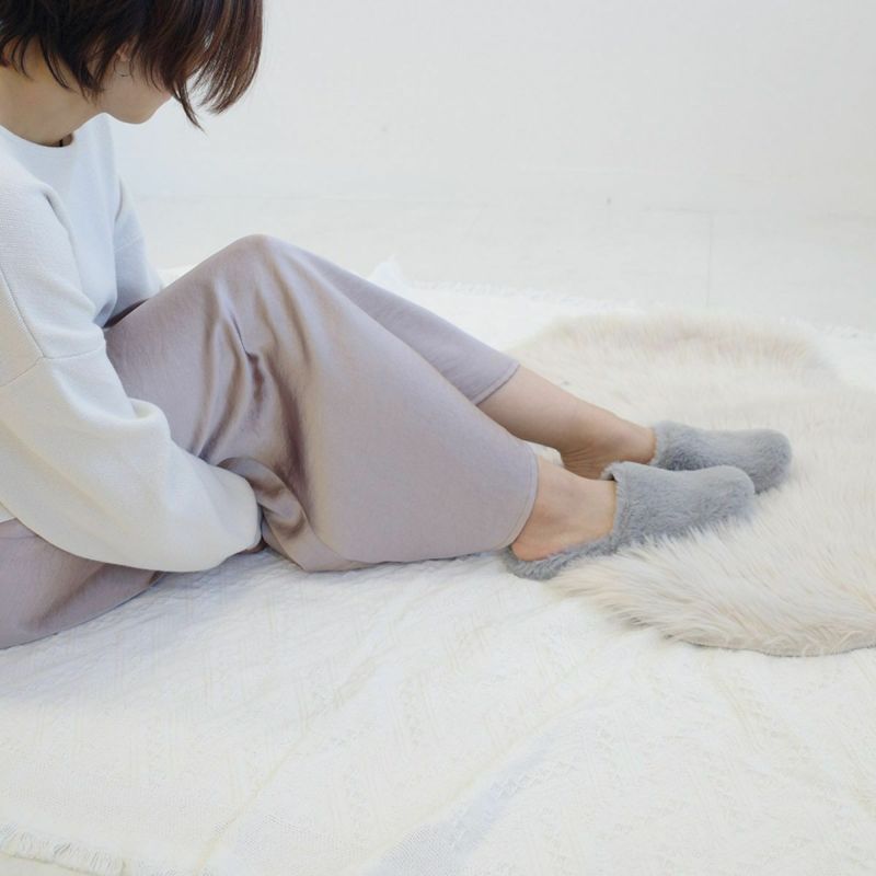 大人可愛い、くすみカラーのルームシューズ。もこもこふわふわのファーで冬のお部屋を可愛く快適に。内側メッシュ素材でムレを防止します。