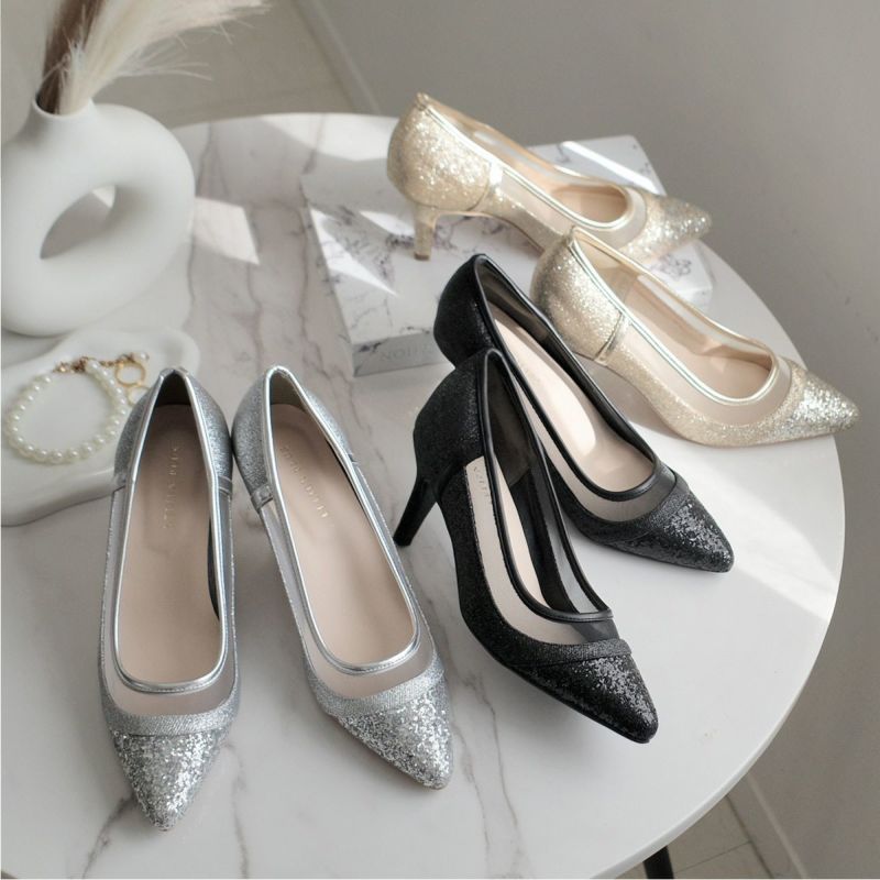 素材感の違うグリッターと抜け感のあるチュールを施した360度どの角度から見ても輝きを放つ洗練された1足です。いつものドレスやスーツスタイルに投入すれば、より一層ゴージャスに、コーディネートを格上げしてくれます。