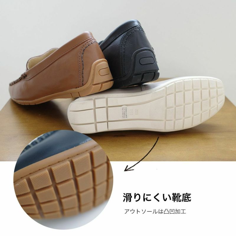 3cmのインヒールで、さりげなくスタイルアップ。クッション性のある中敷きと裏地で歩きやすく疲れにくいインヒールローファー。