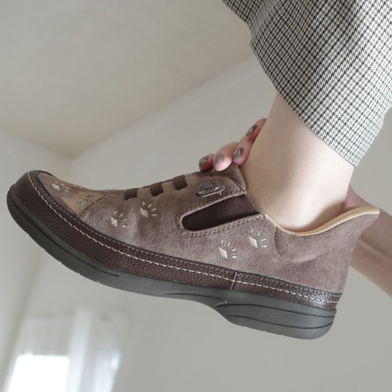 両手が塞がっていても脱ぎ履きらくちん!カカトに体重をかけると、スルッと楽に履ける。忙しい毎日も、さっと履けてさっとお出かけできる。