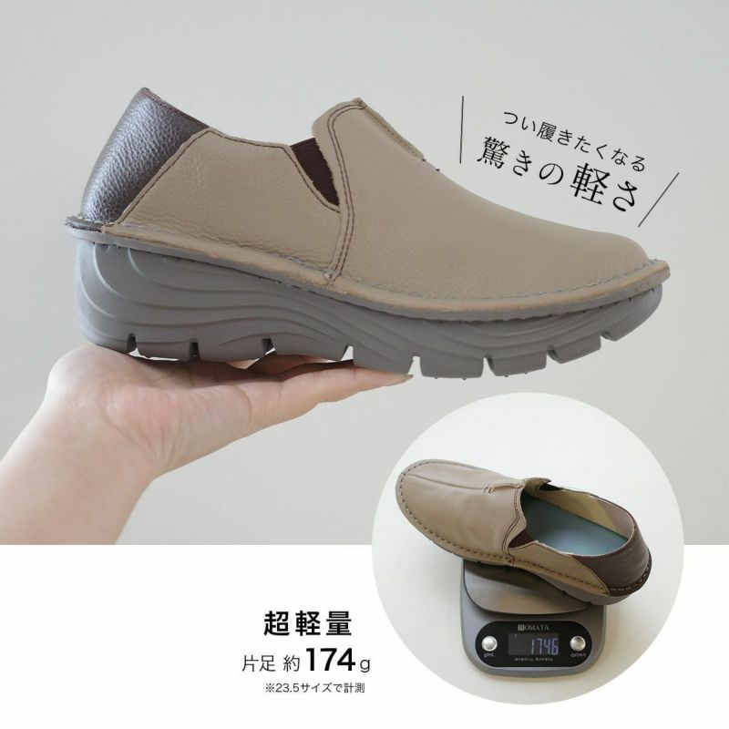 おどろきの超・軽量。旅行や立ち仕事などの強い味方です。脱ぎ履きしやすいスリッポンタイプは、オールシーズン活躍すること間違いなし。