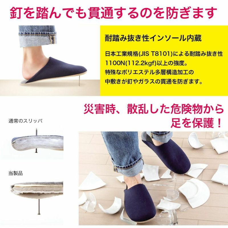 耐踏み抜き性インソール内蔵で釘やガラス片などの危険物から足を守ります。普段はルームシューズとして、もしものときにはかかとにゴムをかけて固定できるので、避難の際も脱げにくい。