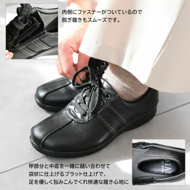 内側にファスナー付きで靴紐を結んだまま脱ぎ履きできるのもポイントです